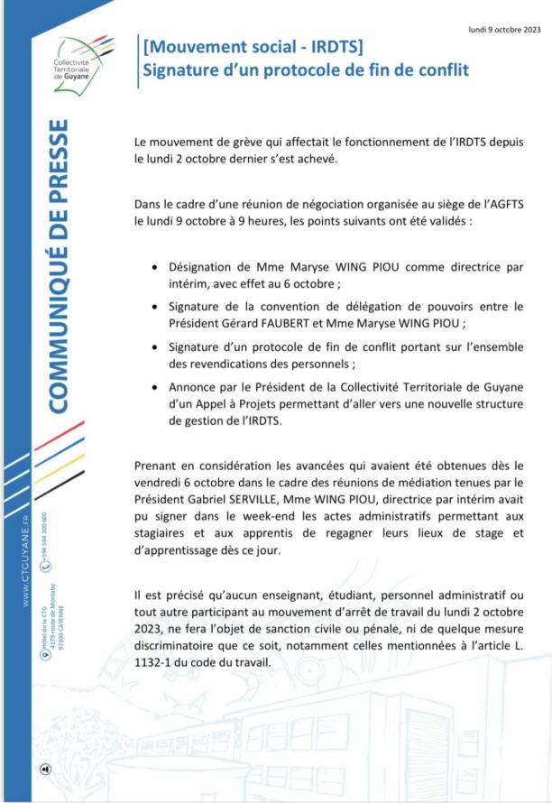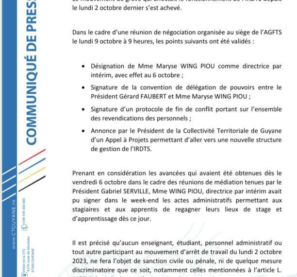 Prenant en considération les avancées qui avaient été obtenues dès le vendredi 6 octobre dans le cadre des réunions de médiation tenues par le Président Gabriel SERVILLE, Mme WING PIOU, directrice par intérim avait pu signer dans le week-end les actes administratifs permettant aux stagiaires et aux apprentis de regagner leurs lieux de stage et d’apprentissage dès ce jour.