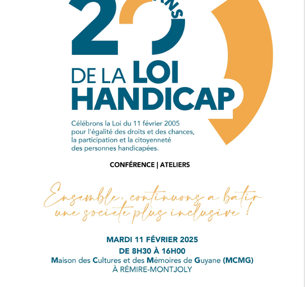La Collectivité Territoriale de Guyane et la Maison Départementale pour les Personnes Handicapées (MDPH) célèbrent les 20 ans de la loi pour l’égalité des droits et des chances des personnes en situation de handicap, le mardi 11 février 2025, de 8h30 à 16h, à la Maison des Cultures et des Mémoires de Guyane.