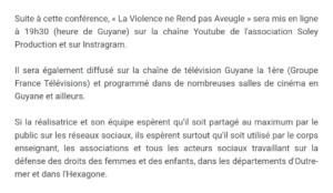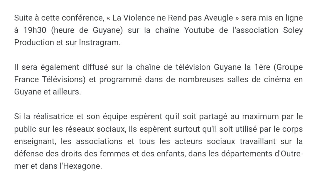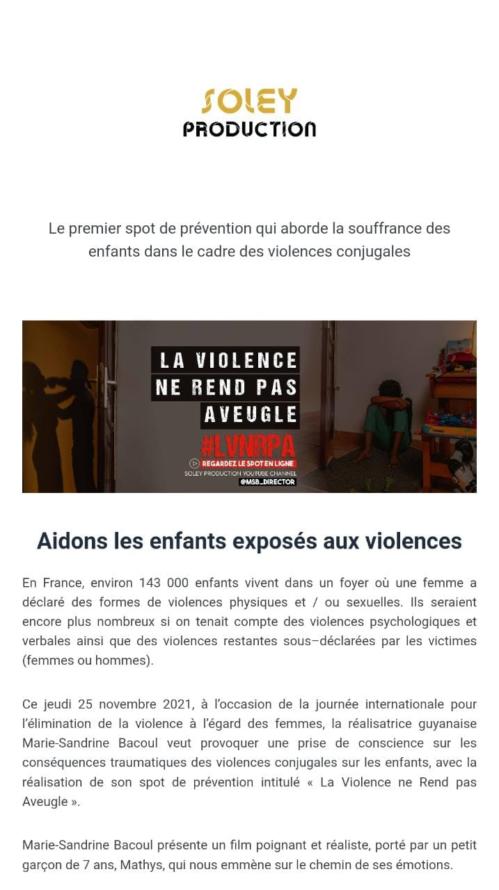 Découvrez en ligne le premier spot guyanais de prévention qui aborde la souffrance des enfants dans le cadre des violences conjugales, réalisé par Soley Production.