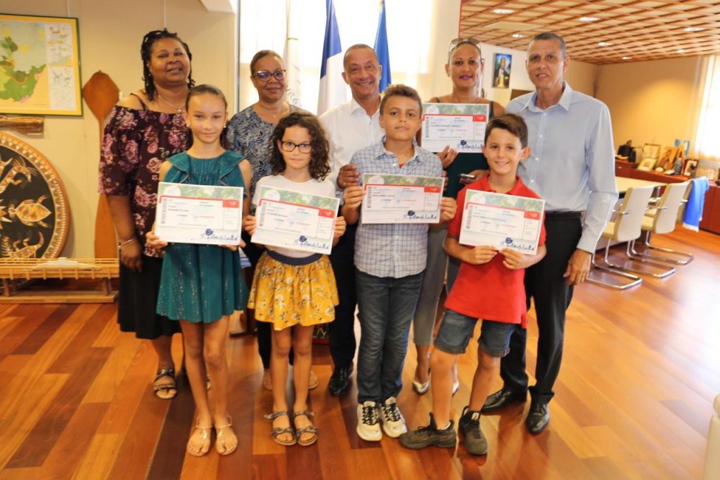 Le Président de la Collectivité Territoriale de Guyane, Rodolphe Alexandre, le 12ème Vice-Président, délégué à l’Éducation à la Formation Professionnelle et à l’Apprentissage, Claude Plenet, et d’autres collaborateurs de la Collectivité Territoriale de Guyane ont remis les billets d’avion aux 4 élèves et à leur enseignante.