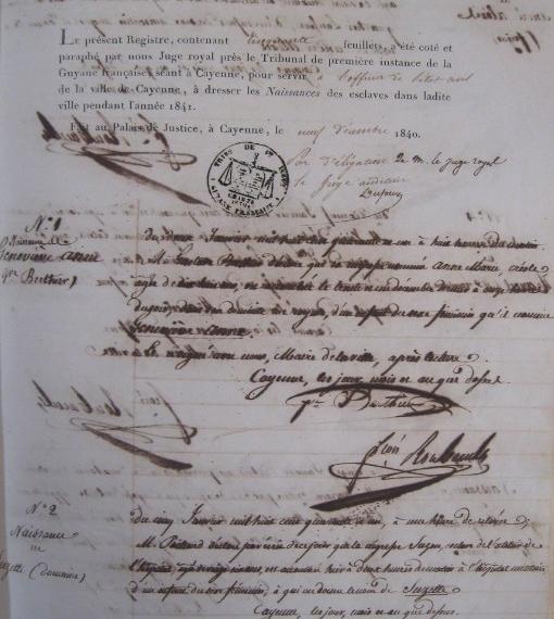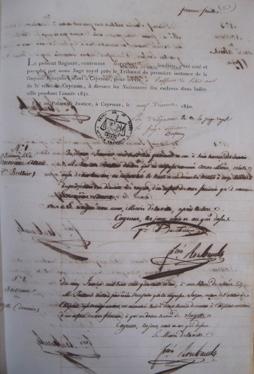 L’état civil des esclaves du chef-lieu de la colonie de la Guyane française correspond à plus de 3 000 actes de naissance, mariage et décès. C’est de loin la circonscription la plus fournie. Ces registres sont importants sur le plan documentaire, car ils contiennent beaucoup d’actes qui concernent des personnes venant des différents quartiers de la colonie. Nombreuses, en effet, étaient les femmes à accoucher à Cayenne dans la maison de ville de leur propriétaire ou chez une accoucheuse de la place ; nombreux étaient les hommes et femmes à être soignés et mourir chez leur maître ou dans l’un des établissements hospitaliers. L’état civil de la ville de Cayenne contient également de nombreux actes concernant des esclaves du Domaine, qui étaient répartis en ateliers de travail ou mis à disposition de services (gouvernement, hôpital…).