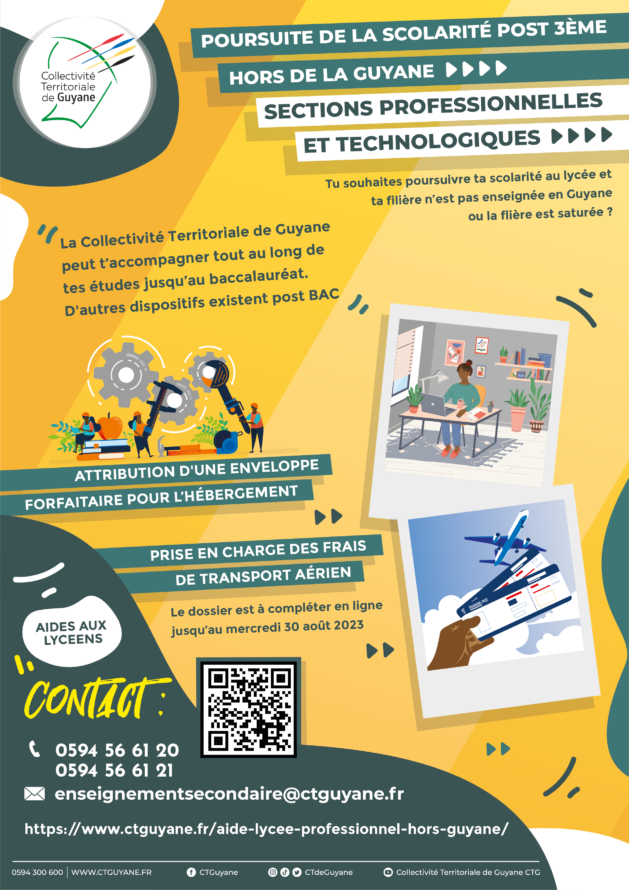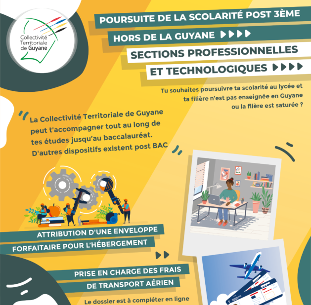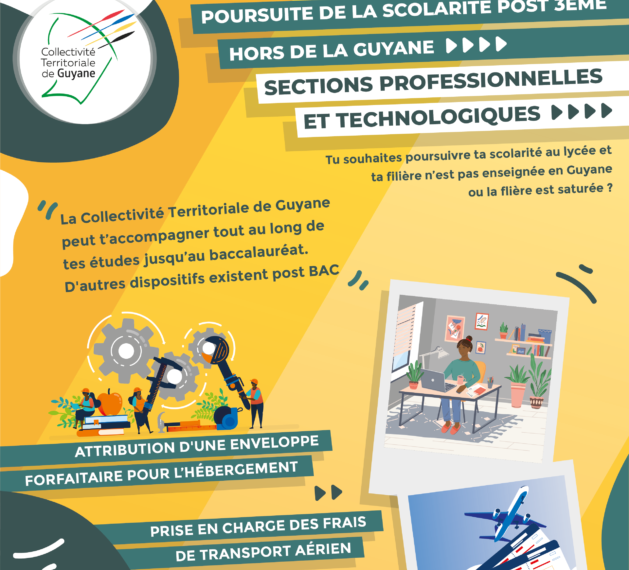 Afin d’accompagner les jeunes guyanais de sections professionnelles et technologiques souhaitant poursuivre leur scolarité post 3ème hors de Guyane, à travers un baccalauréat, CAP ou BEP, non dispensés sur le territoire, la Collectivité Territoriale de Guyane propose un dispositif d’aide visant à contribuer à leur offrir des conditions optimales de réussites.
