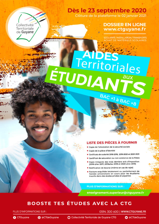 La réussite des étudiants guyanais étant un des fers de lance de la CTG, afin d’y contribuer, la CTG a mis en place les Aides Territoriales aux Etudiants (ATE). Ces aides sont attribuées aux étudiants inscrits dans un cycle d’études supérieures, ou équivalent, suivies en Guyane ou à l’extérieur.