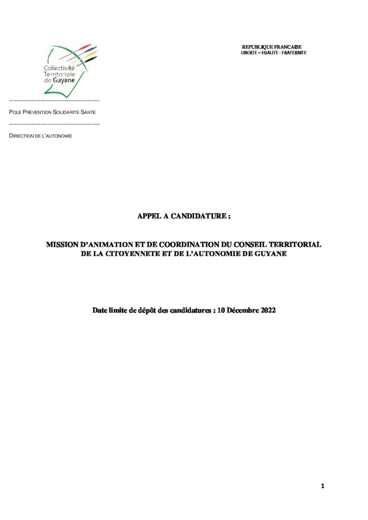 Chaque candidat devra adresser un dossier de candidature à la Collectivité Territoriale de Guyane – Direction de l’Autonomie – 19 Rue Schoelcher 97300 Cayenne, en une seule fois, par courrier recommandé avec accusé de réception, le 10 Décembre 2022 à 12h au plu tard.