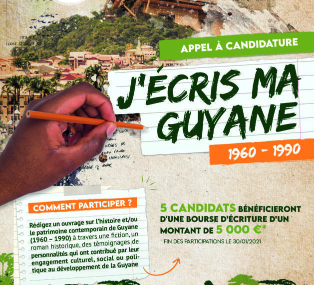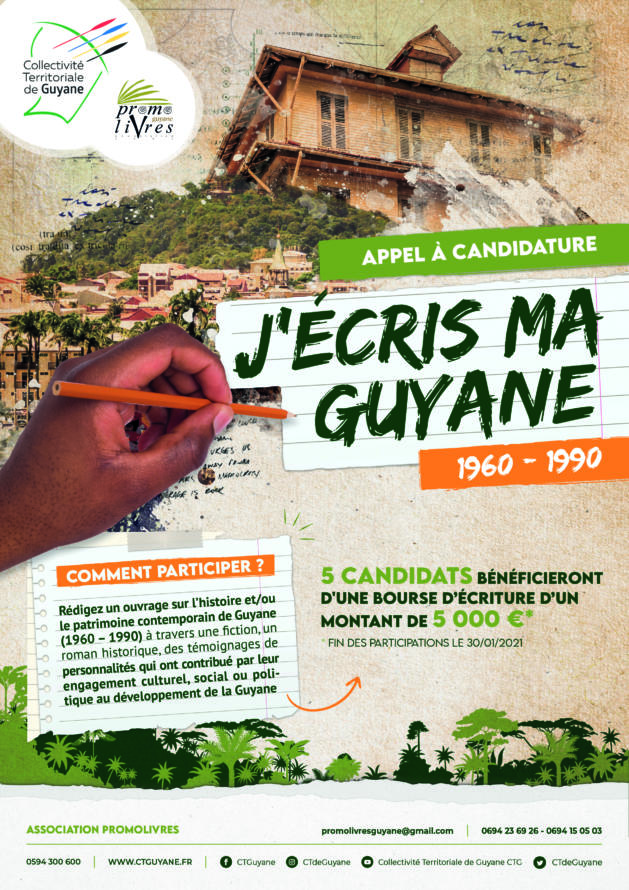 Dans le cadre de la pandémie de la Covid-19, la Collectivité Territoriale de Guyane (CTG) renforce le soutien apporté à la création artistique et culturelle en lançant des appels à projets notamment dans le domaine de l’économie du livre. L’appel à candidatures “« J’écris ma Guyane : 1960-1990 » porte sur la rédaction d’un ouvrage sur l’histoire et/ou le patrimoine contemporain de Guyane (1960 – 1990) à travers une fiction, un roman historique, des témoignages de personnalités qui ont contribué par leur engagement culturel, social ou politique au développement de la Guyane.