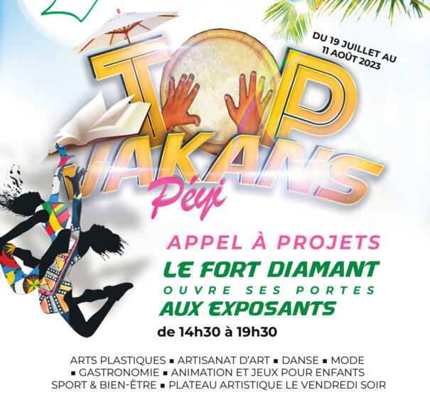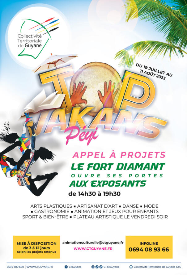 La Collectivité Territoriale de Guyane sollicite les associations et les artisans culturels à manifester leur intérêt en vue de leur participation au TOP VAKANS PEYI 2023 se déroulant dans l’enceinte et sur le parking extérieur du Fort Diamant Route des Plages à Rémire Montjoly.