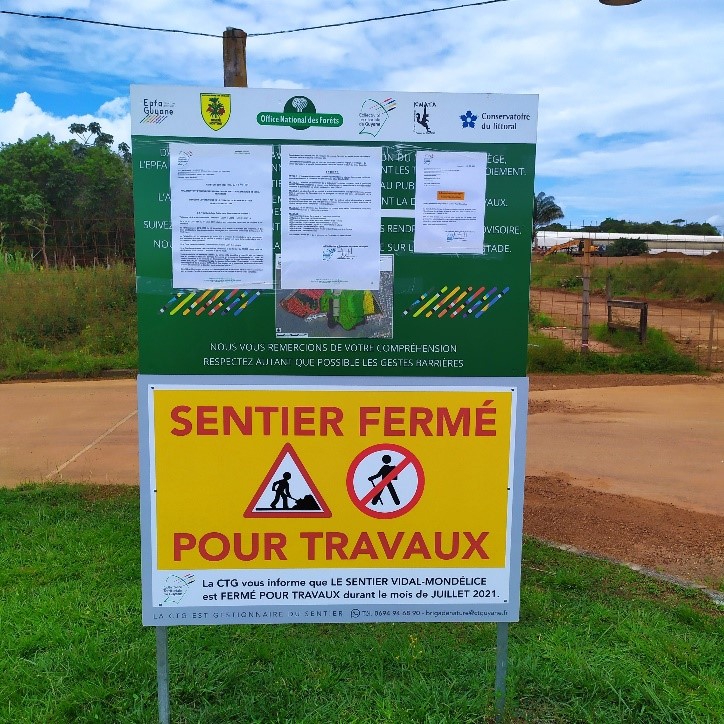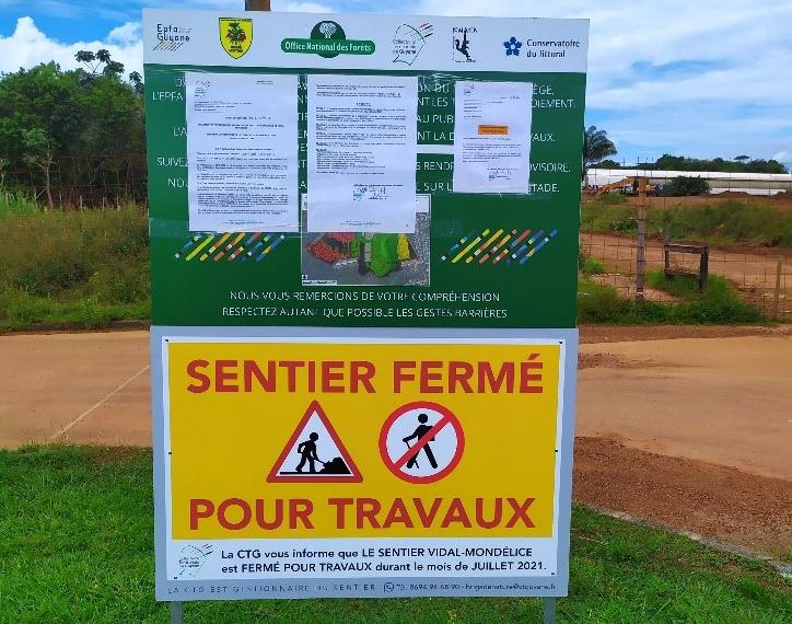 Dans le cadre de travaux d’aménagement relatifs à l’entrée du sentier “Vidal-Mondélice”, la Collectivité Territoriale de Guyane informe la population de la prolongation de la durée de fermeture de ce site, jusqu’au 31 août 2021, pour des raisons de sécurité.