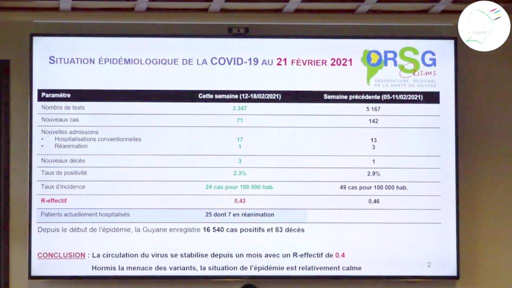 Au vendredi 19 février 2021, le taux de vaccination sur tout le territoire s’élevait à 0,89% (soit 2 338 personnes, source ORSG). Le Comité alerte sur l’importance de se saisir de la période d’accalmie que connaît actuellement le territoire pour vacciner massivement.
