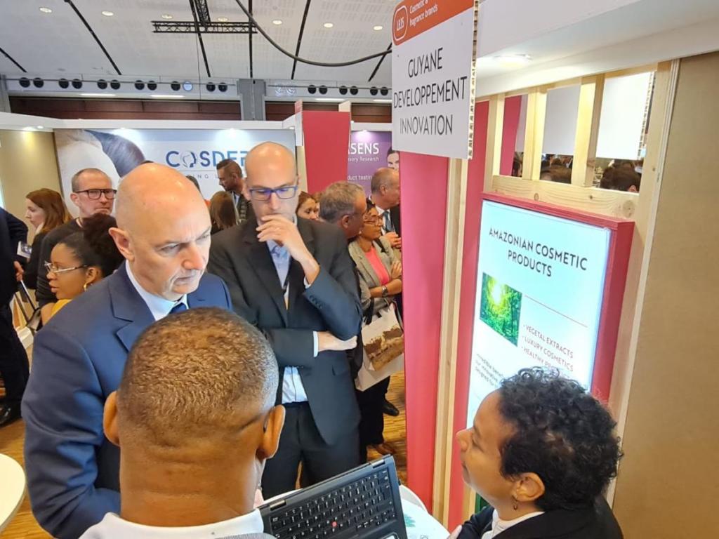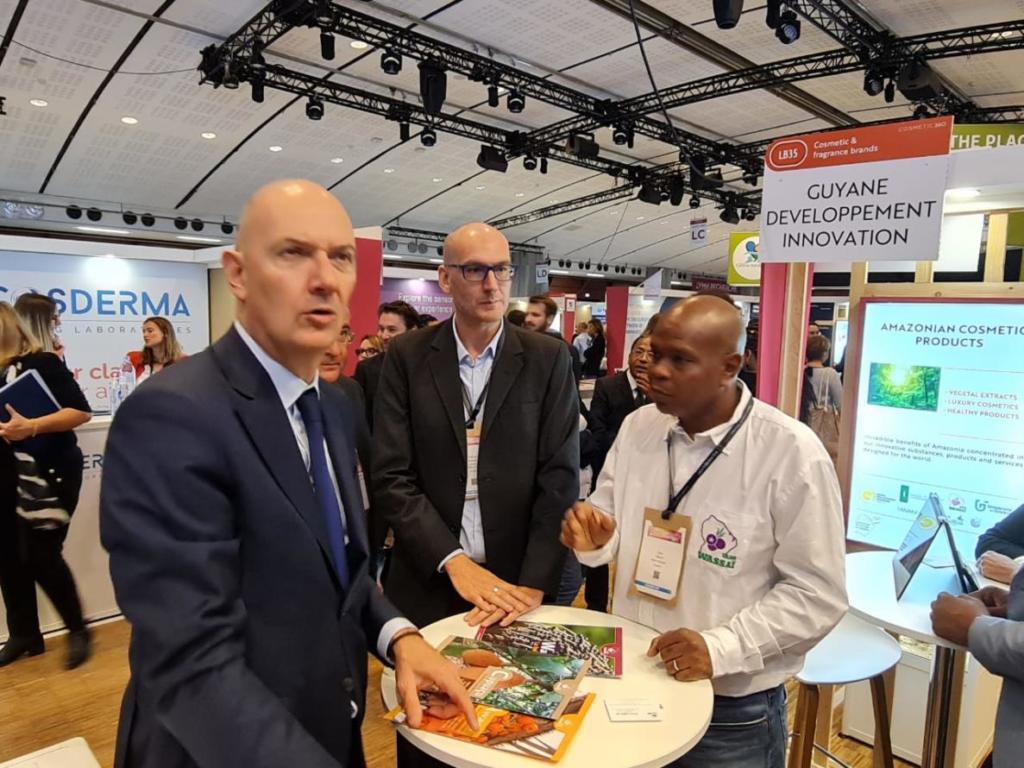 Afin de valoriser la biodiversité et les entreprises cosmétiques guyanaise, la CTG, représentée par Philippe Bouba, 5ème vice-président de la CTG délégué à l’Enseignement supérieur et à la Recherche, a validé la présence et la prise en charge d’une délégation guyanaise au Salon Cosmetic 360 du 12 et 13 octobre 2022. L’opération pilotée par GDI a permis de valoriser les produits de 4 entreprises guyanaises locales ainsi que les travaux de l’Université de Guyane (UG). Des atouts pour le territoire que le vice-président Philippe Bouba a pu présenter à Roland Lescure, ministre délégué chargé de l’industrie, sur le stand de la Guyane à Cosmetic 360.