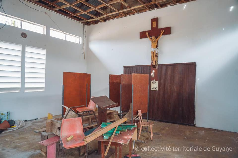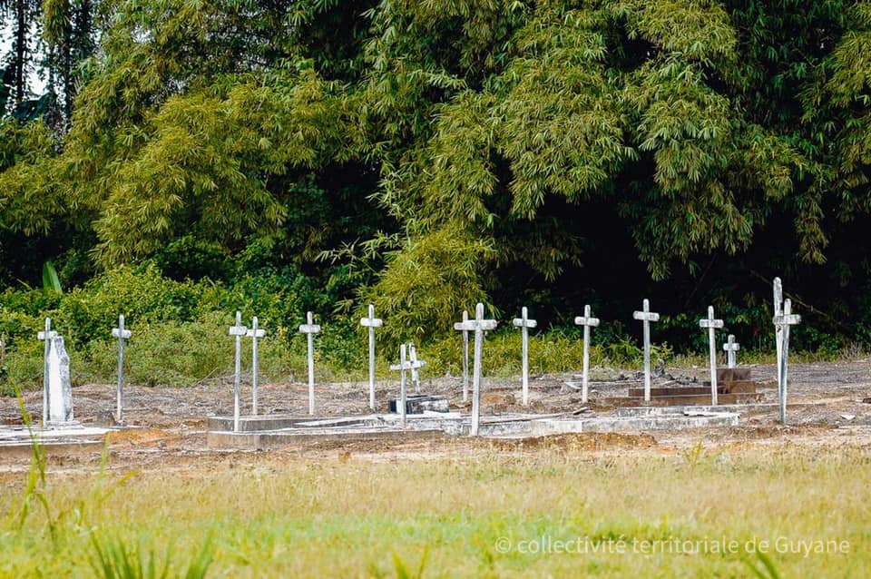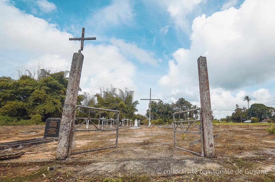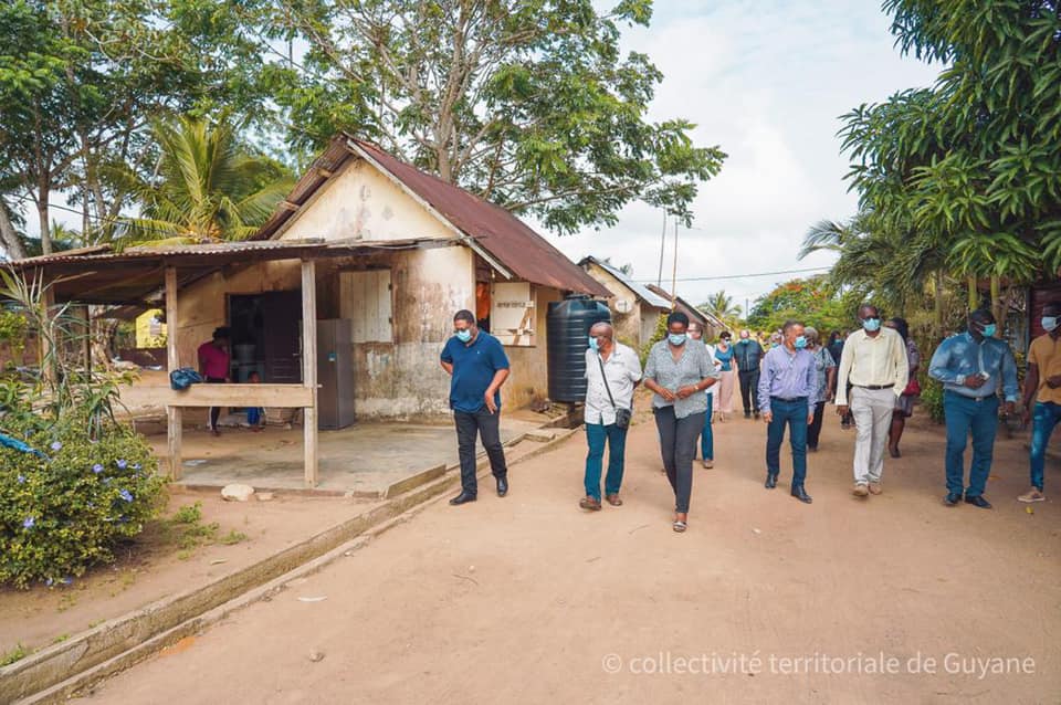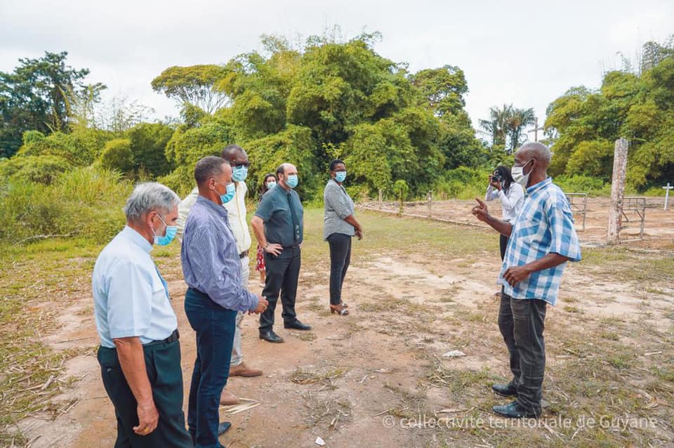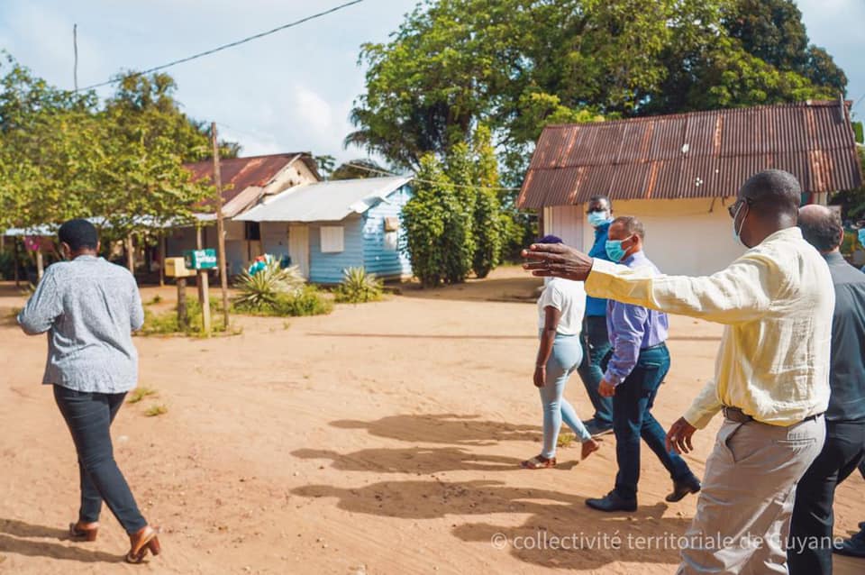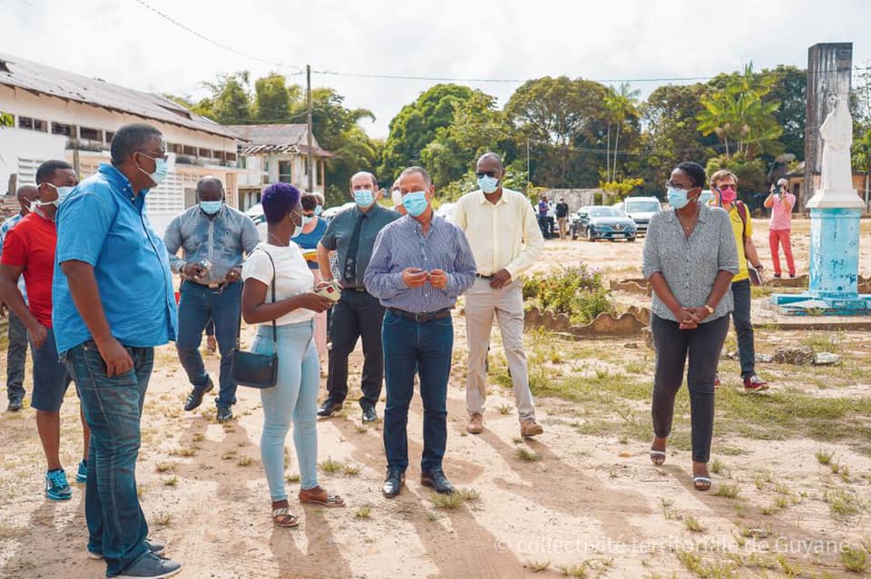 Une visite du village passant par l’église, les cases, le cimetière, effectuée par Albéric Benth, maire de Mana, et pour laquelle le président de la CTG était accompagné par Monseigneur Emmanuel Lafont, évêque de Guyane, de Denis Galimot, 10e vice-président délégué à l’insertion professionnelle et à l’égalité des territoires, de Smail Yahia, directeur général adjoint en charge des infrastructures, des équipements et appui aux collectivités de la CTG, de Jeanne Joseph-Laigné, directrice générale adjointe déléguée à la culture, au patrimoine et identités à la CTG, en présence d’Yves Dareau, sous-préfet de Saint-Laurent du Maroni, et Michel-Ange Aurélien, président de l’association Sarpa (investie dans la restauration du site).