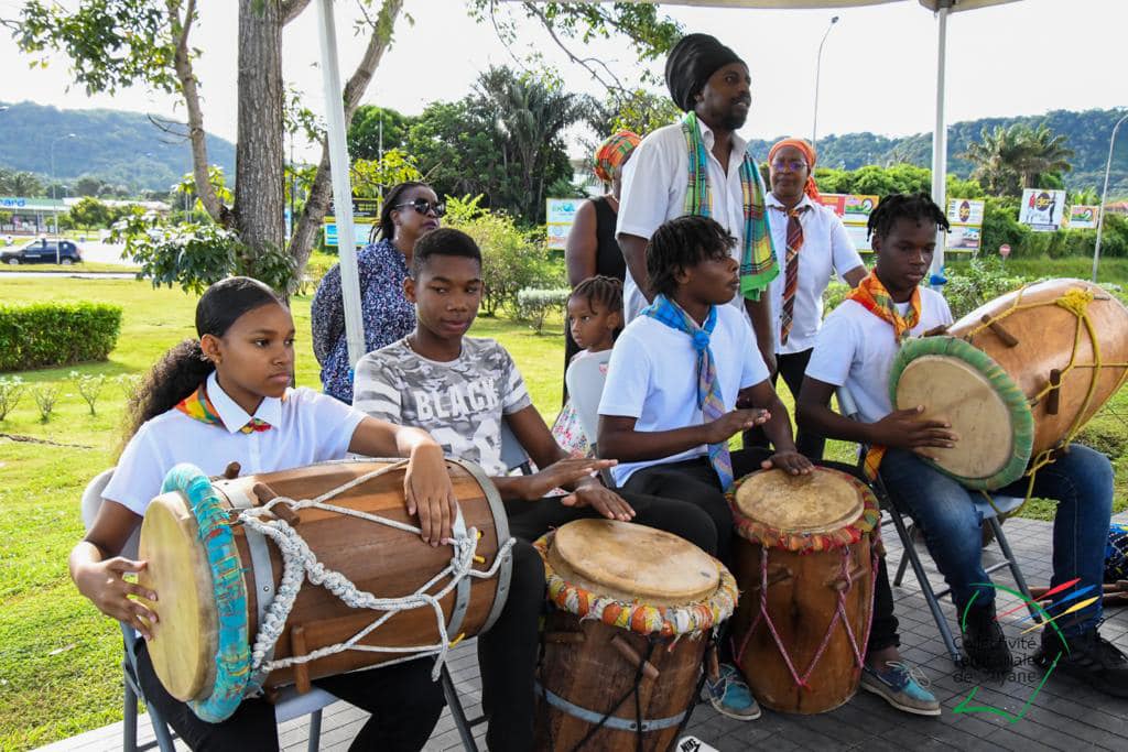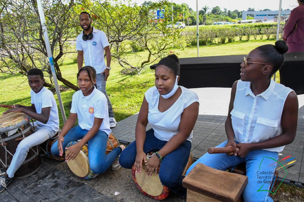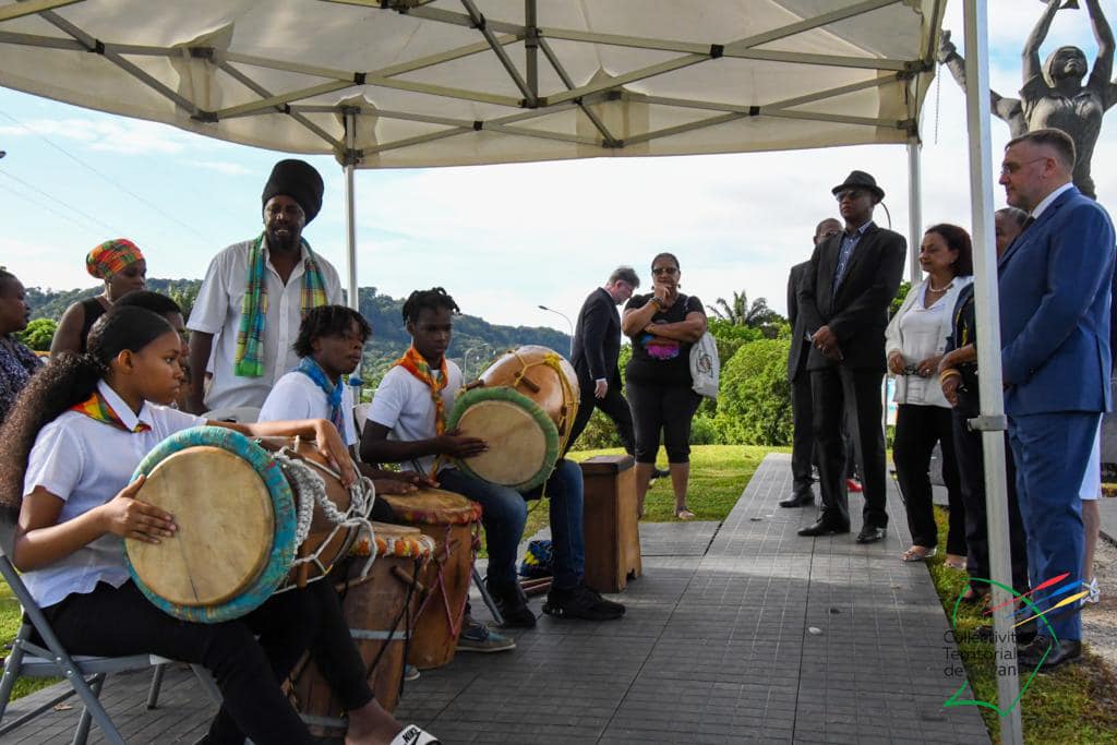 Après le traditionnel dépôt de gerbe commun des autorités locales et le moment de recueillement face au monument, plusieurs prestations étaient proposées lors de cette commémoration, permettant à l’association « Tambou Lévé », aux jeunes accompagnés par Hervé Jean-Charles et à ceux du conservatoire d’exprimer leur talent à travers la musique traditionnelle.