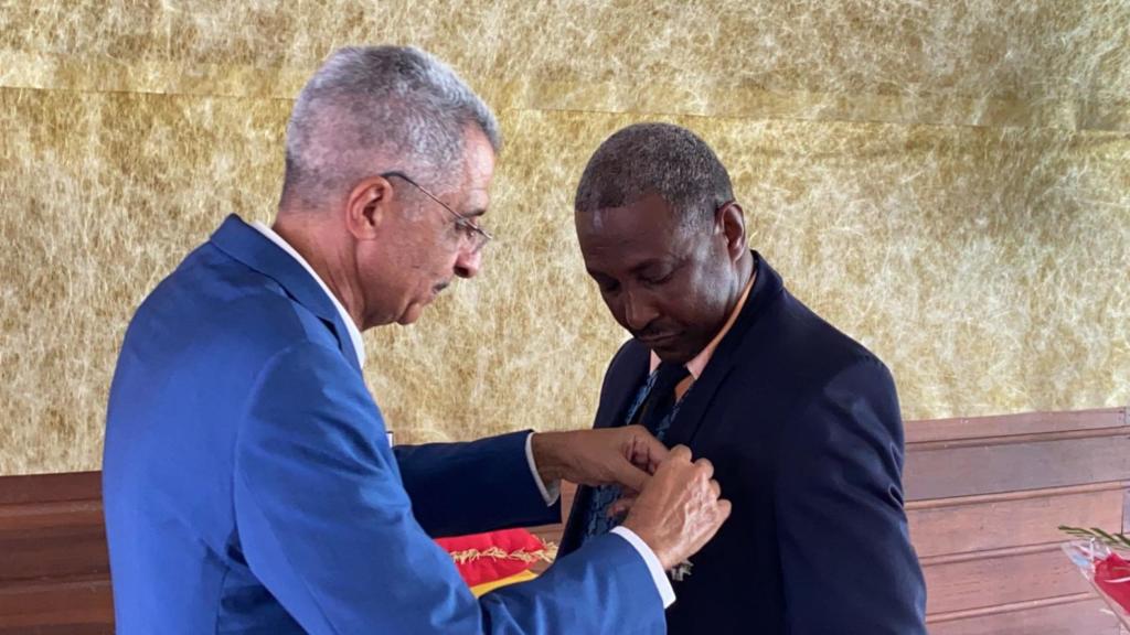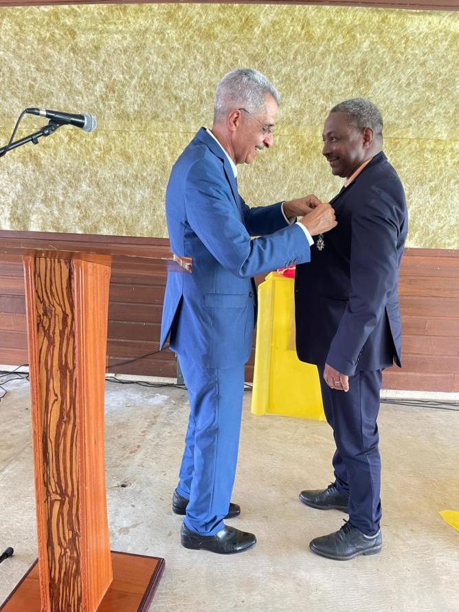 Roger Alain Aron, 7e vice-président délégué à l’agriculture, la pêche, la souveraineté alimentaire et l’évolution statutaire, assistait à cet évènement lors duquel Antoine Karam, ancien sénateur et ancien président de région, remettait à Georges Elfort, suite à sa nomination au grade de chevalier de l’ordre national de la légion d’honneur, la médaille qui lui revenait, en présence d’élus, de ses administrés et de ses proches.
