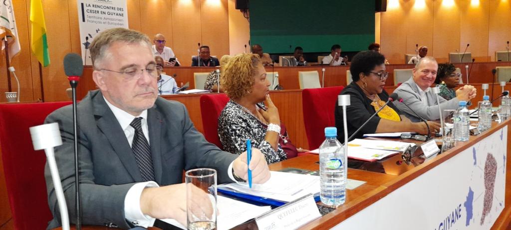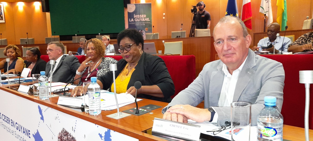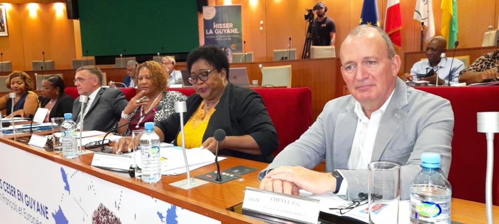 La séance était co-présidée par Annie Robinson-Chocho, 2ème vice-présidente de la Collectivité Territoriale de Guyane (CTG) déléguée à l’Éducation et aux Constructions scolaires, d’Eric Chevée, président du CESER de France, de Thierry Queffelec, préfet de la Région Guyane, d’élus territoriaux et de nombreuses autres spécialistes et personnalités institutionnelles.