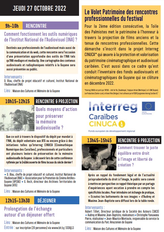 Pour la 2ème édition consécutive, l’Association – Guyane Cinéma Audiovisuel et Multimédia (A-GCAM), organise, dans le cadre du Festival la Toile des Palmistes, des rencontres professionnelles. Cette démarche s’inscrit dans le cadre du projet Interreg CINUCA qui oeuvre à la protection et valorisation du patrimoine cinématographique et audiovisuel caribéen.