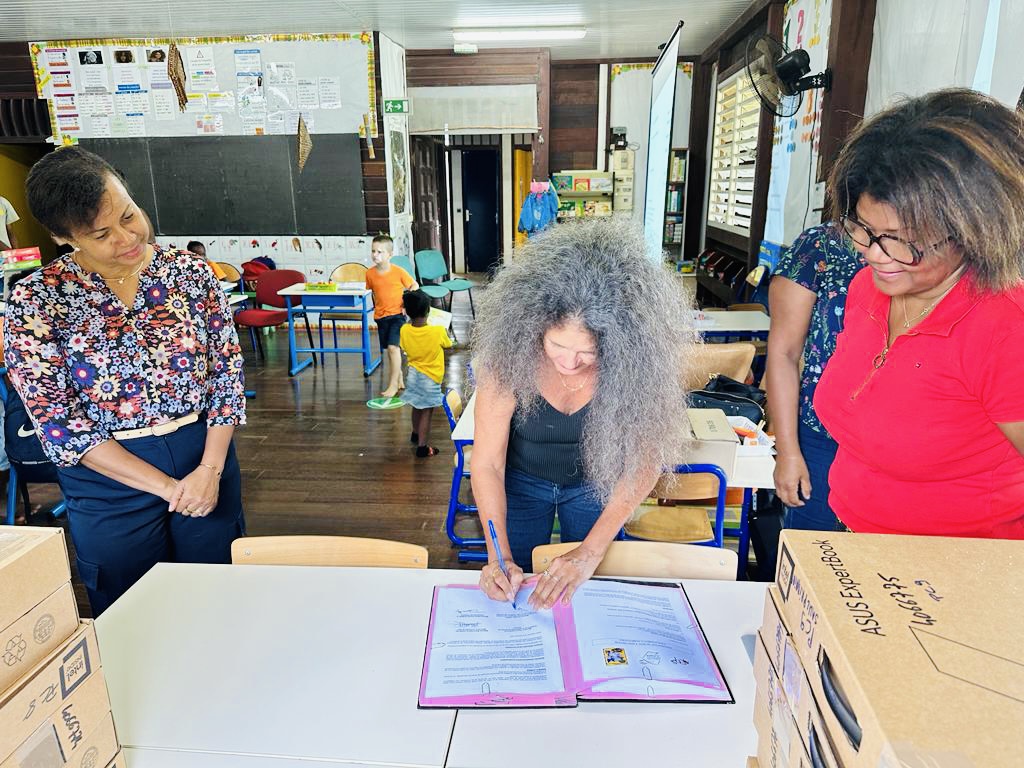 Isabelle Vernet, conseillère territoriale déléguée à la réussite scolaire et à la lutte contre le décrochage, et Marie-Lucienne Rattier, conseillère territoriale déléguée au numérique, à la transformation digitale et à l’innovation ont rappelé à cette occasion les orientations de la Collectivité Territoriale de Guyane en matière de renforcement de la cohésion numérique sur le territoire.