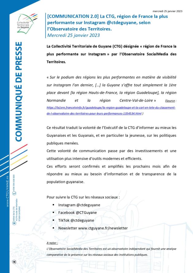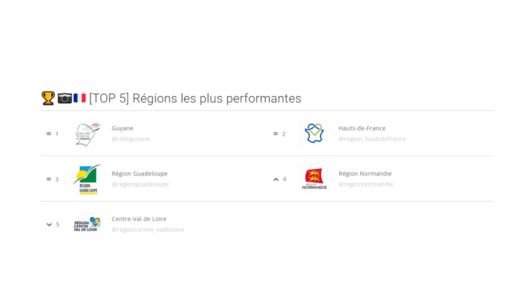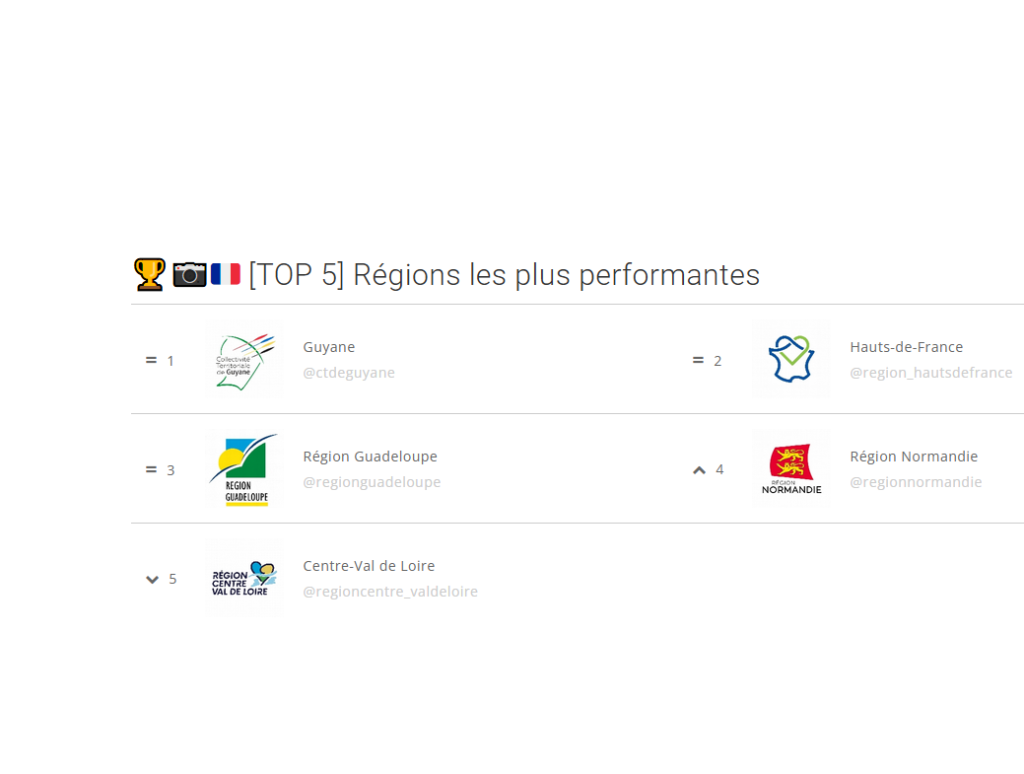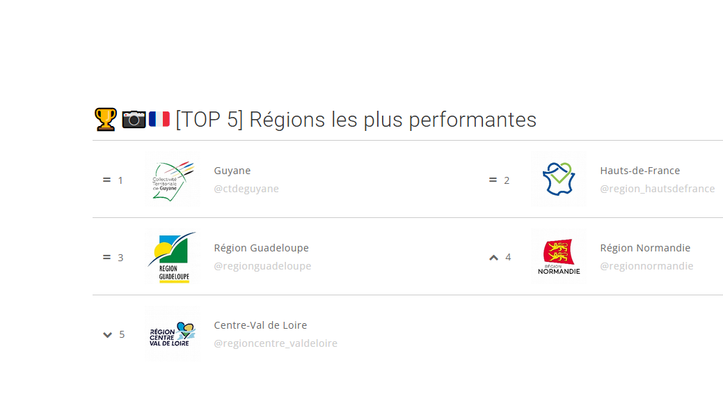 « Sur le podium des régions les plus performantes en matière de visibilité sur Instagram l’an dernier, […] la Guyane s’offre tout simplement la 1ère place devant [la région Hauts-de-France, la région Guadeloupe], la région Normandie et la région Centre-Val-de-Loire » (Source : https://la1ere.francetvinfo.fr/guadeloupe/la-region-guadeloupe-et-la-carl-en-tete-du-classement-de-l-observatoire-des-territoires-pour-leurs-performances-1354534.html)