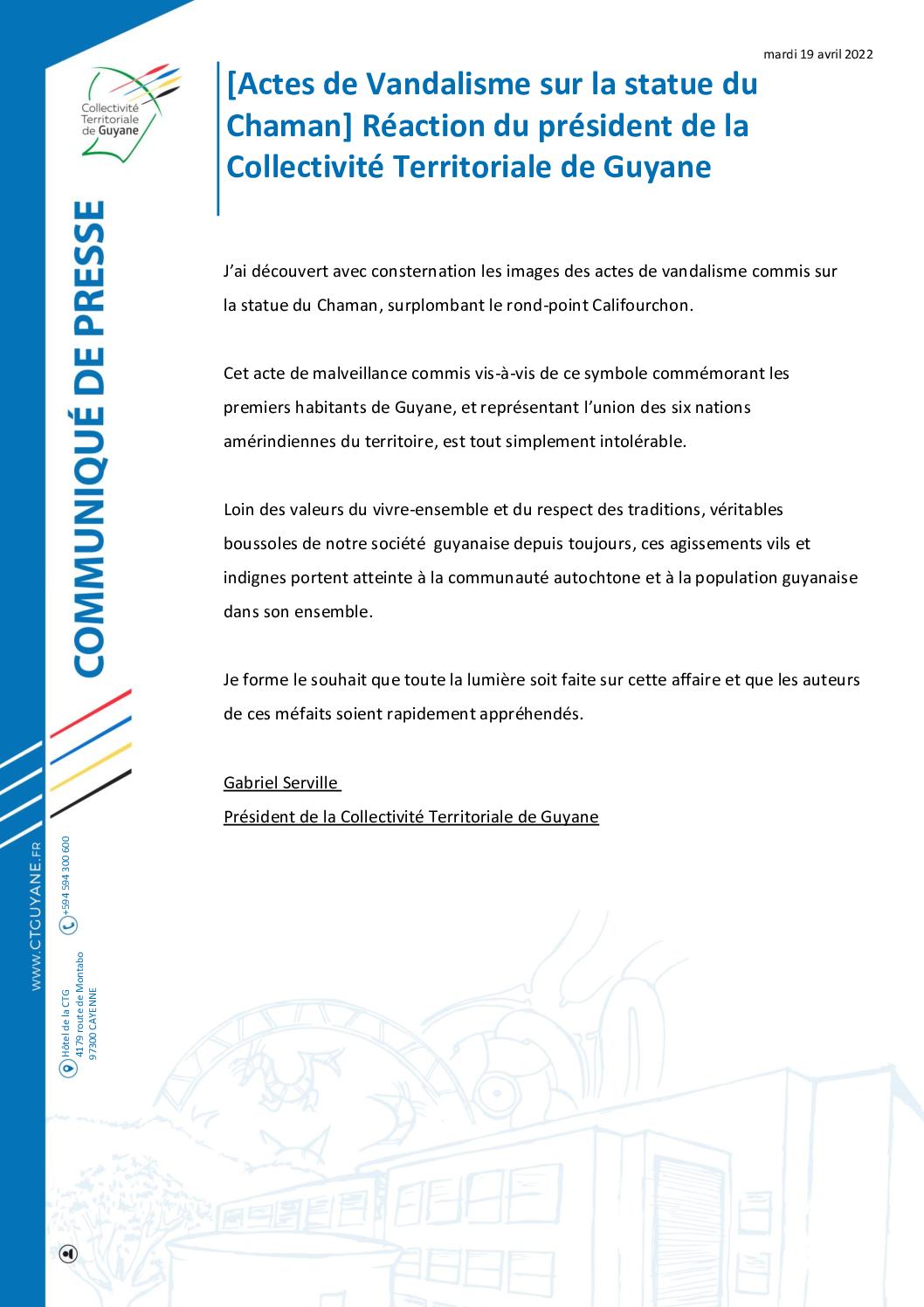 [Communiqué] Actes de Vandalisme sur la statue du Chaman : réaction du président de la Collectivité Territoriale de Guyane