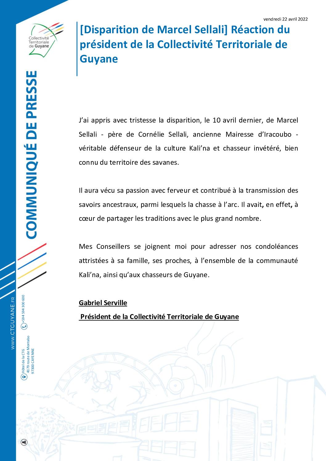 [COMMUNIQUÉ] Disparition de Marcel Sellali : réaction du président de la Collectivité Territoriale de Guyane