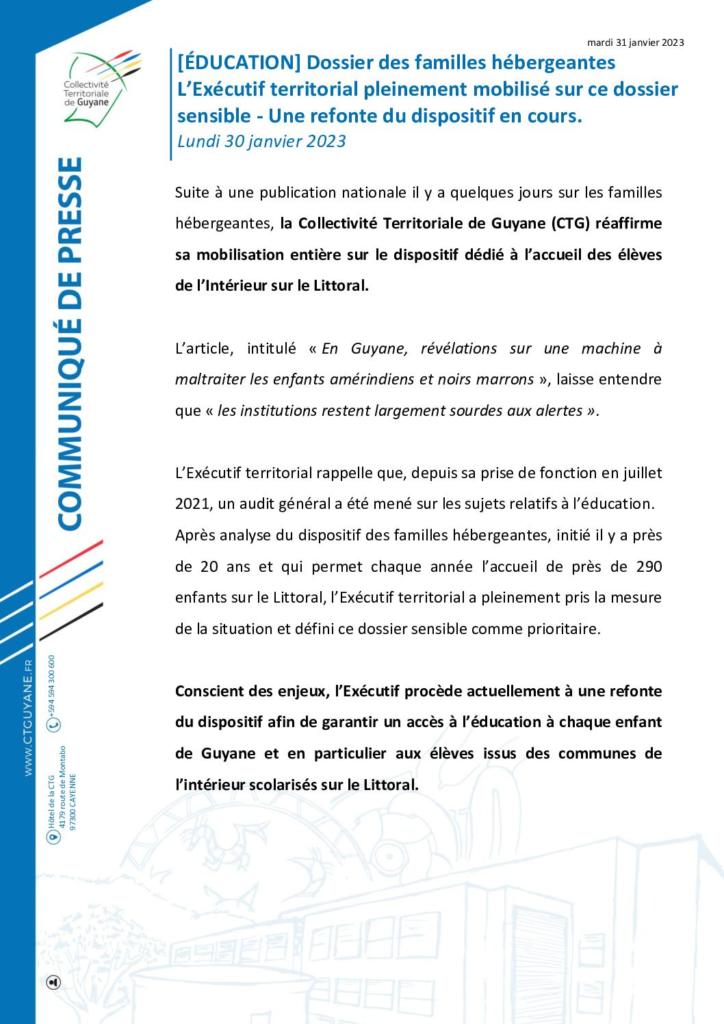 [COMMUNIQUÉ] ÉDUCATION : dossier des familles hébergeantes – L’Exécutif territorial pleinement mobilisé sur ce dossier sensible : une refonte du dispositif en cours.