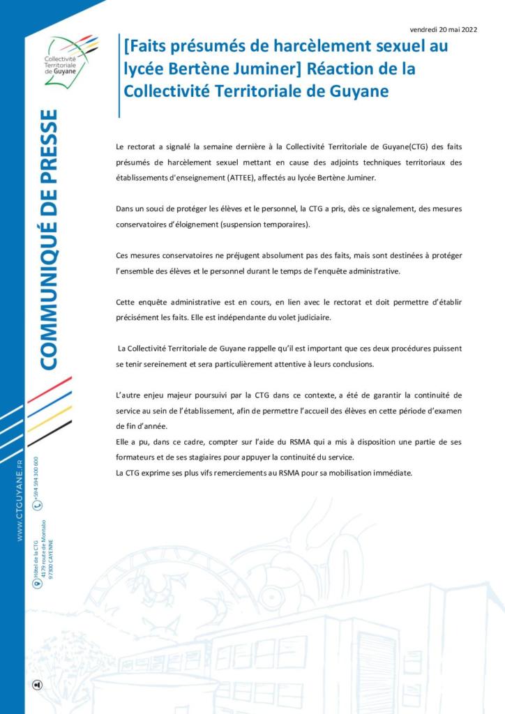 [COMMUNIQUÉ] Faits présumés de harcèlement sexuel au lycée Bertène Juminer / Réaction de la Collectivité Territoriale de Guyane