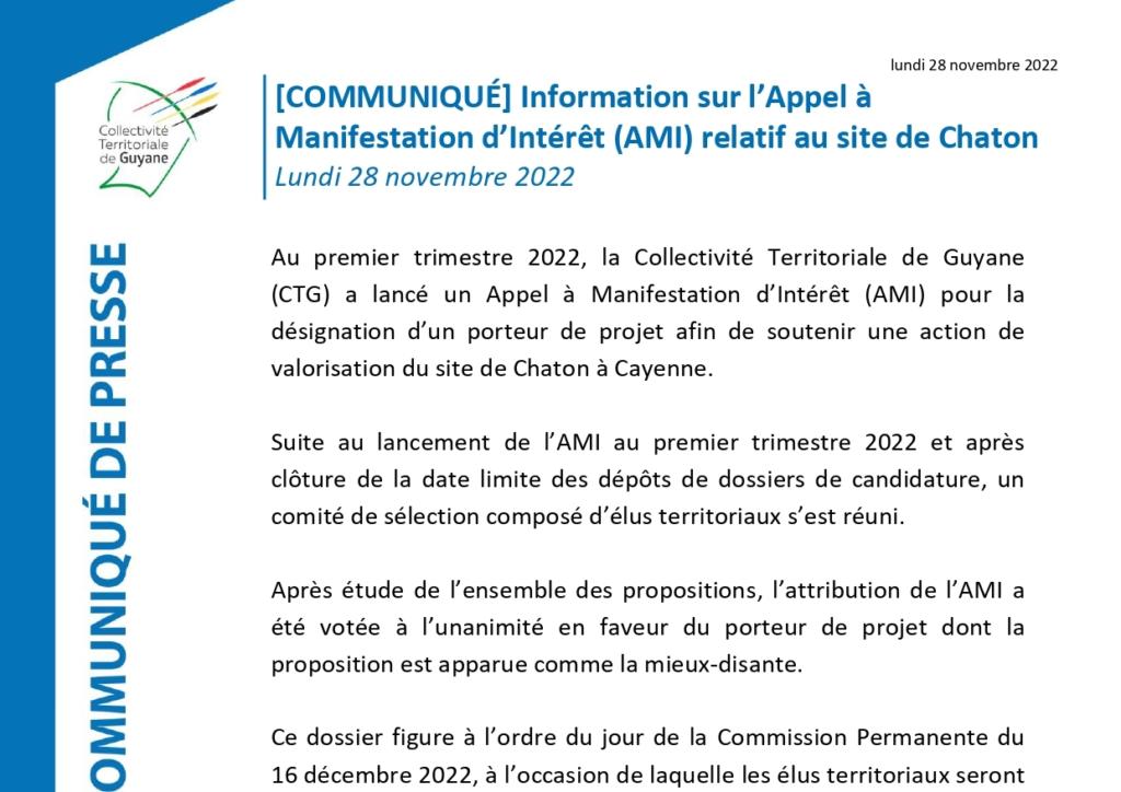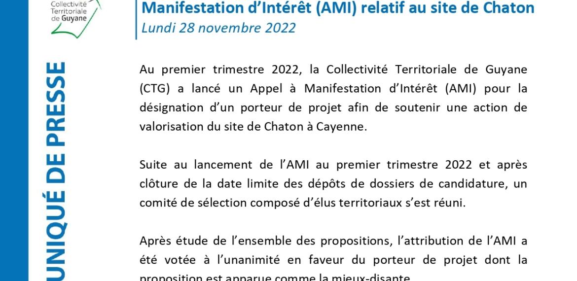 [COMMUNIQUÉ] Information sur l’Appel à Manifestation d’Intérêt (AMI) relatif au site de Chaton