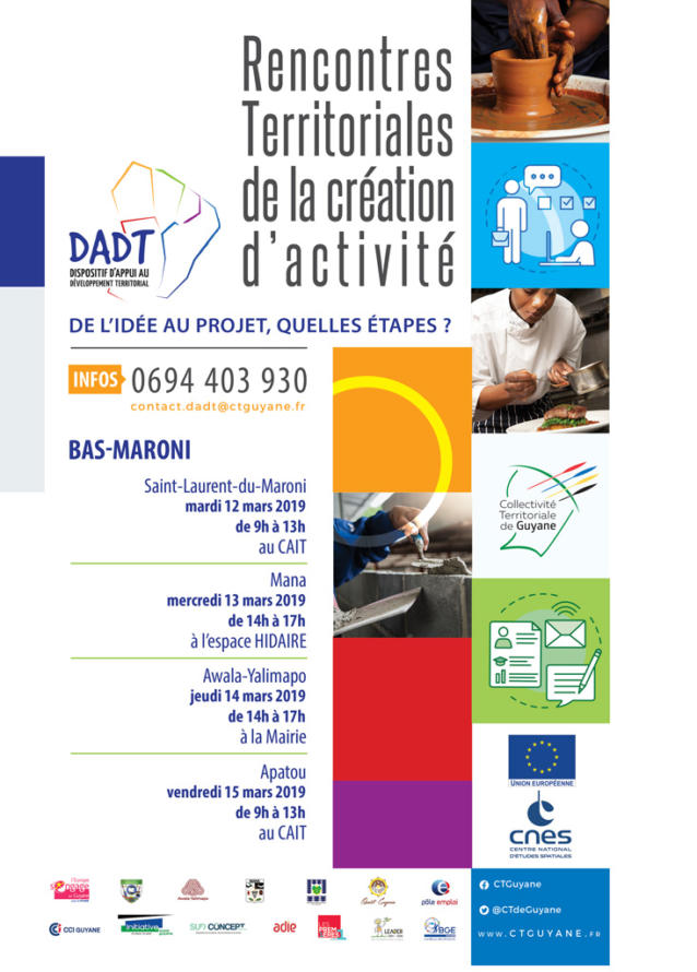 Les animations territoriales du DADT débuteront le 12 mars 2019 à Saint-Laurent du Maroni, avant de se poursuivre, jusqu’au 15 mars, sur les autres communes du Bas-Maroni (Mana, Awala-Yalimapo, Apatou) puis de l’ensemble des autres bassins du territoire.