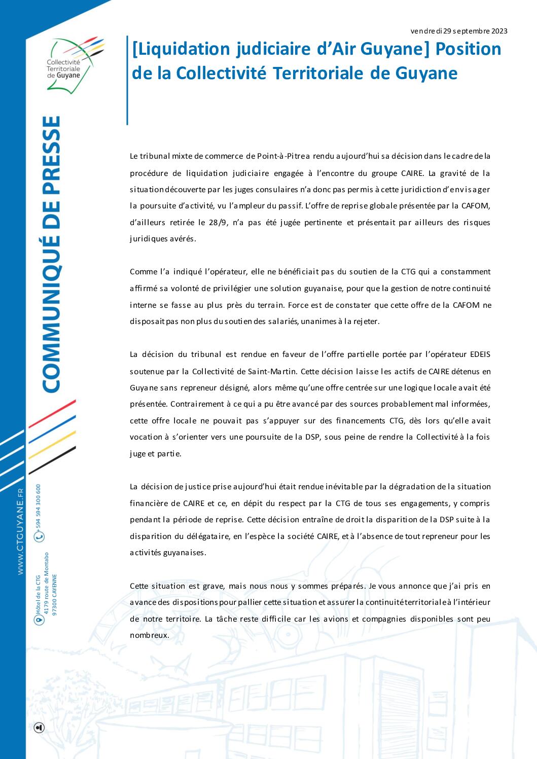 La décision de justice prise aujourd’hui était rendue inévitable par la dégradation de la situation financière de CAIRE et ce, en dépit du respect par la CTG de tous ses engagements, y compris pendant la période de reprise. Cette décision entraîne de droit la disparition de la DSP suite à la disparition du délégataire, en l’espèce la société CAIRE, et à l’absence de tout repreneur pour les activités guyanaises.