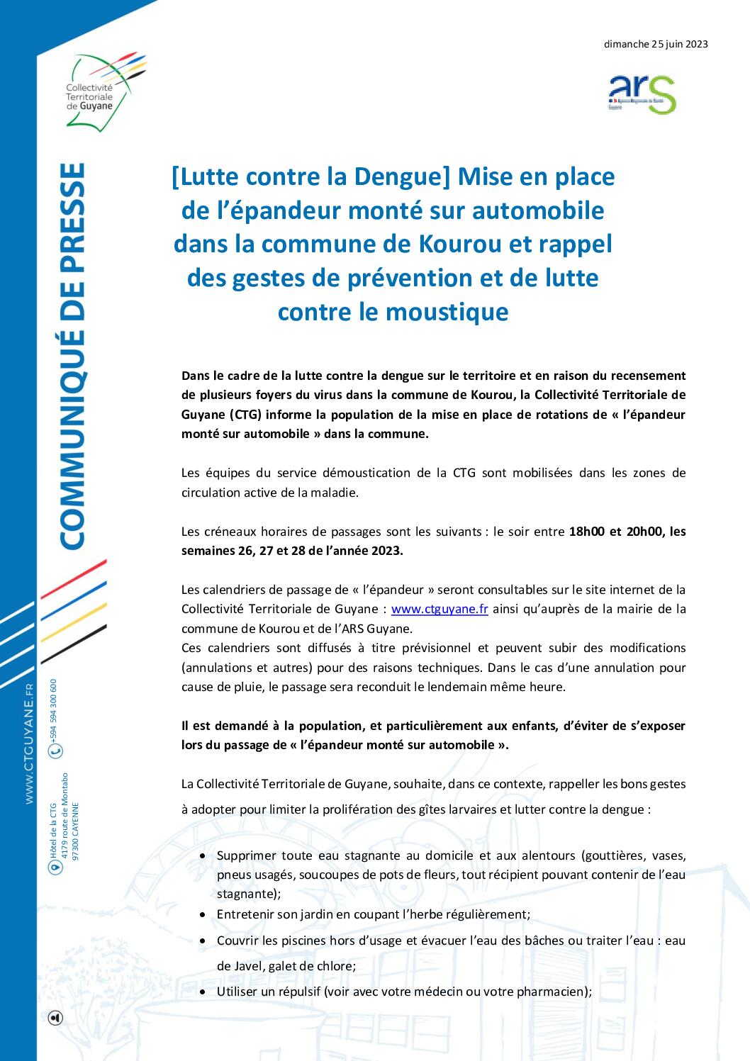 Dans le cadre de la lutte contre la dengue sur le territoire et en raison du recensement de plusieurs foyers du virus dans la commune de Kourou, la Collectivité Territoriale de Guyane (CTG) informe la population de la mise en place de rotations de « l’épandeur monté sur automobile » dans la commune.