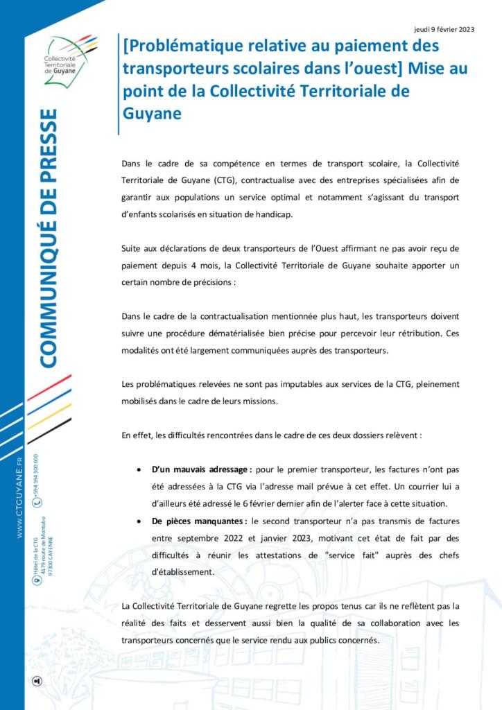 [COMMUNIQUÉ] Problématique relative au paiement des transporteurs scolaires dans l’ouest : mise au point de la Collectivité Territoriale de Guyane