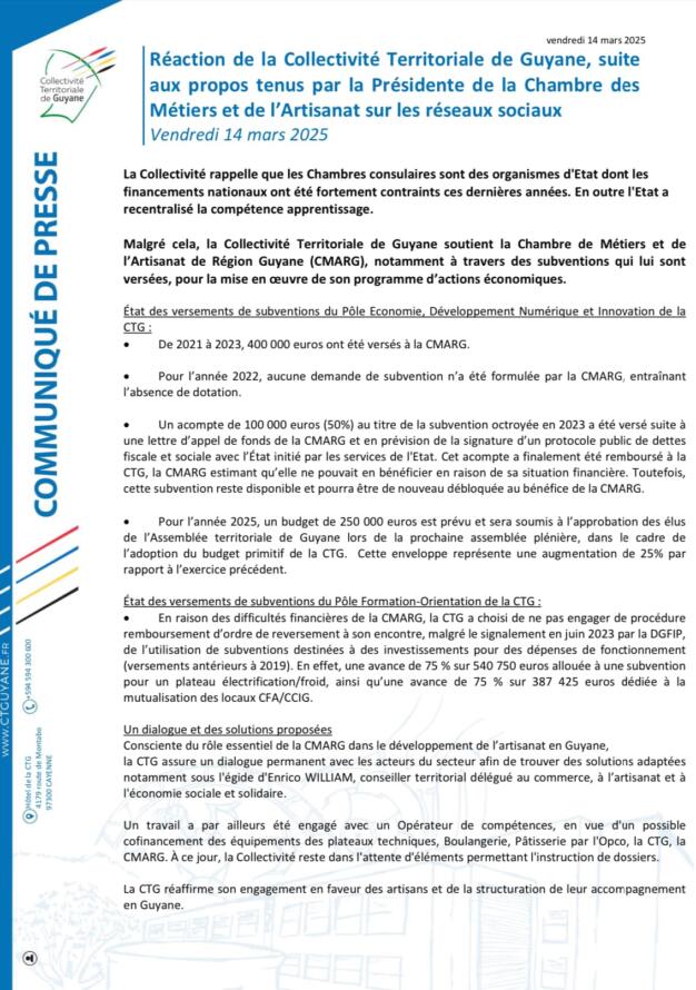 [COMMUNIQUÉ] Réaction de la Collectivité Territoriale de Guyane, suite aux propos tenus par la Présidente de la Chambre des Métiers et de l’Artisanat sur les réseaux sociaux
