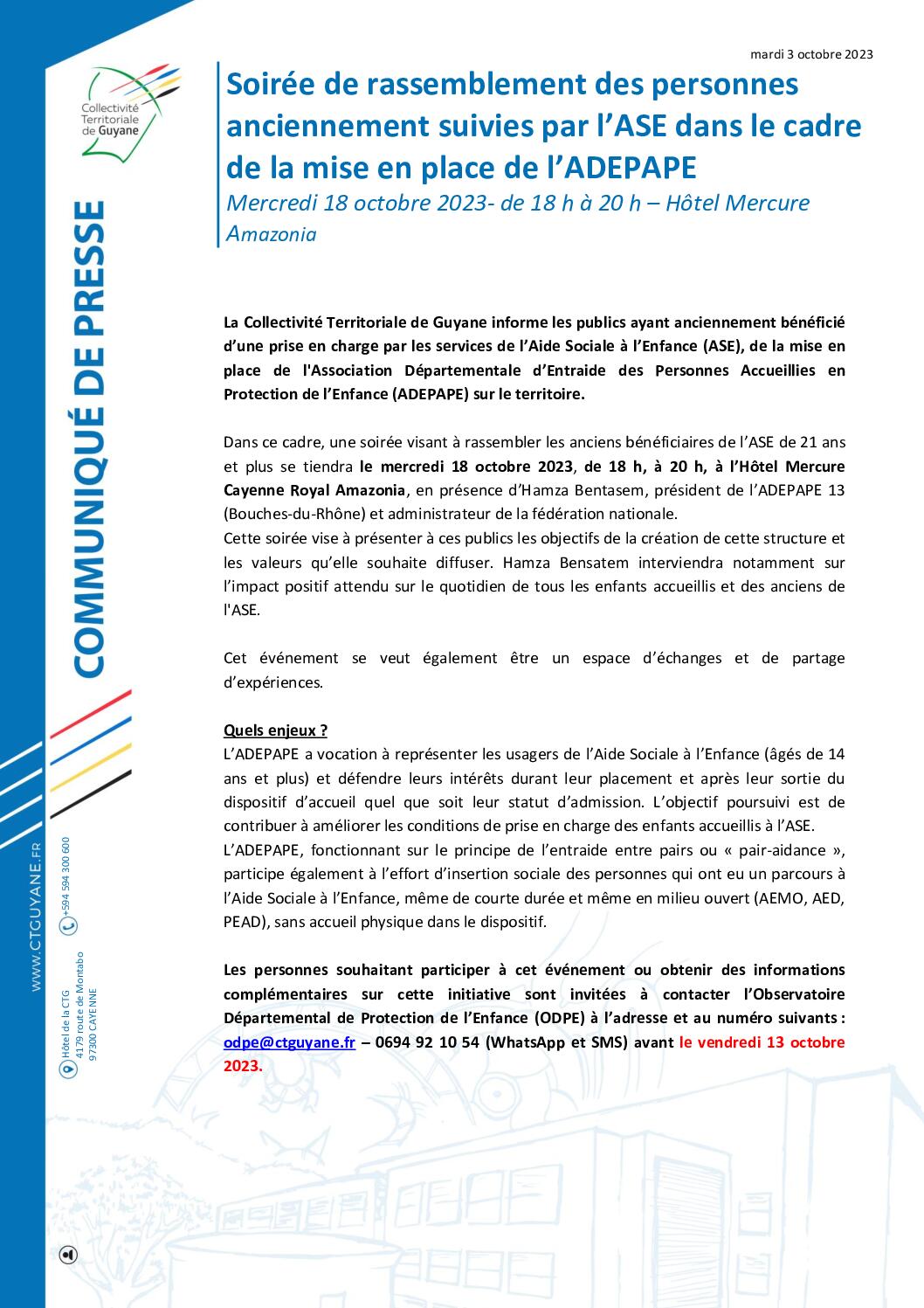 Dans ce cadre, une soirée visant à rassembler les anciens bénéficiaires de l’ASE de 21 ans et plus se tiendra le mercredi 18 octobre 2023, de 18 h, à 20 h, à l’Hôtel Mercure Cayenne Royal Amazonia, en présence d’Hamza Bentasem, président de l’ADEPAPE 13 (Bouches-du-Rhône) et administrateur de la fédération nationale.