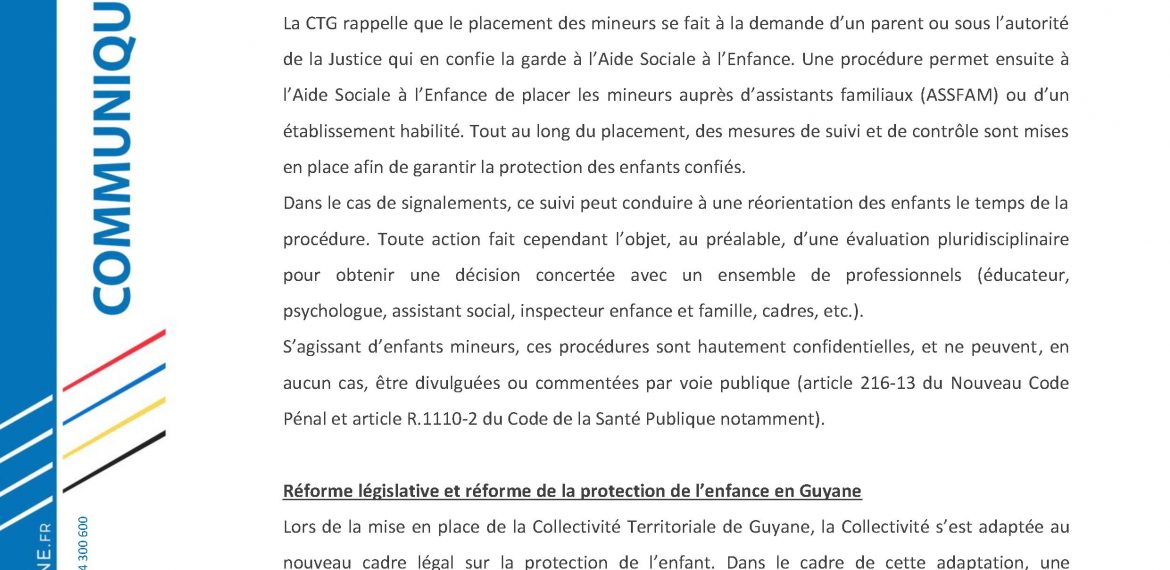Lors de la mise en place de la Collectivité Territoriale de Guyane, la Collectivité s’est adaptée au nouveau cadre légal sur la protection de l’enfant. Dans le cadre de cette adaptation, une dynamique a été engagée afin de réformer le dispositif de protection de l’enfance en Guyane. Des réunions sont ainsi programmées pour accompagner le personnel au changement, maintenir le dialogue et apporter la meilleure protection aux enfants. Ces réunions relèvent d’un caractère confidentiel et nulle personne extérieure aux services et non habilitée ne peut y être associée.