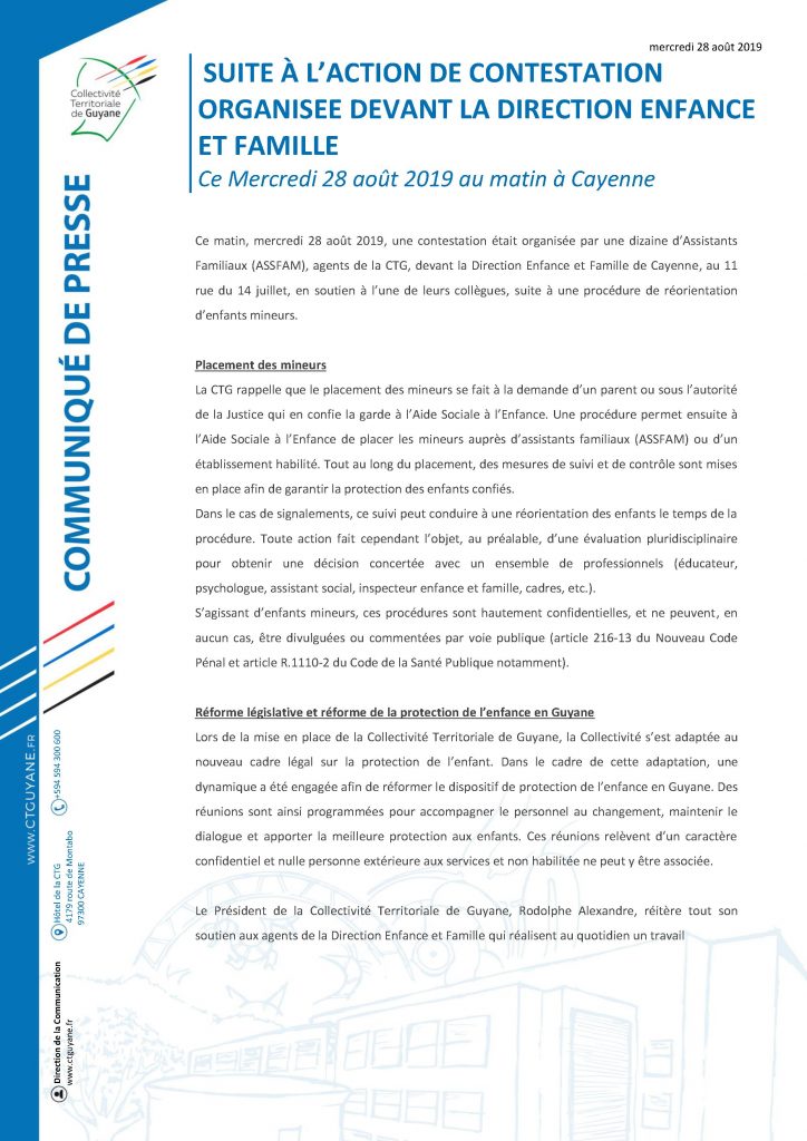 Le Président de la Collectivité Territoriale de Guyane, Rodolphe Alexandre, réitère tout son soutien aux agents de la Direction Enfance et Famille qui réalisent au quotidien un travail considérable dans l’intérêt des mineurs (personnel éducatif, administratif et assistants familiaux).