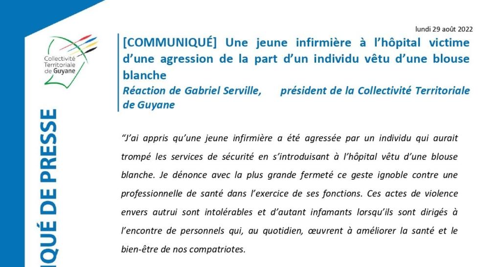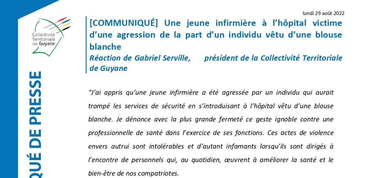 [COMMUNIQUÉ] Une jeune infirmière à l’hôpital victime d’une agression de la part d’un individu vêtu d’une blouse blanche – Réaction de Gabriel Serville, président de la Collectivité Territoriale de Guyane