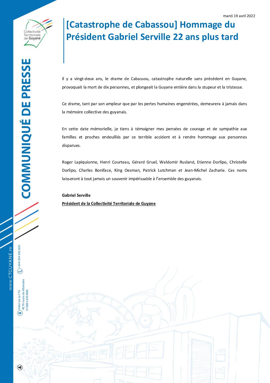 [COMMUNIQUÉ] Vingt-deux ans de la catastrophe de Cabassou : hommage du Président Gabriel Serville