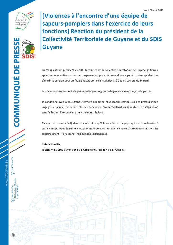 [COMMUNIQUÉ] Violences à l’encontre d’une équipe de sapeurs-pompiers dans l’exercice de leurs fonctions / Réaction du président de la Collectivité Territoriale de Guyane et du SDIS Guyane