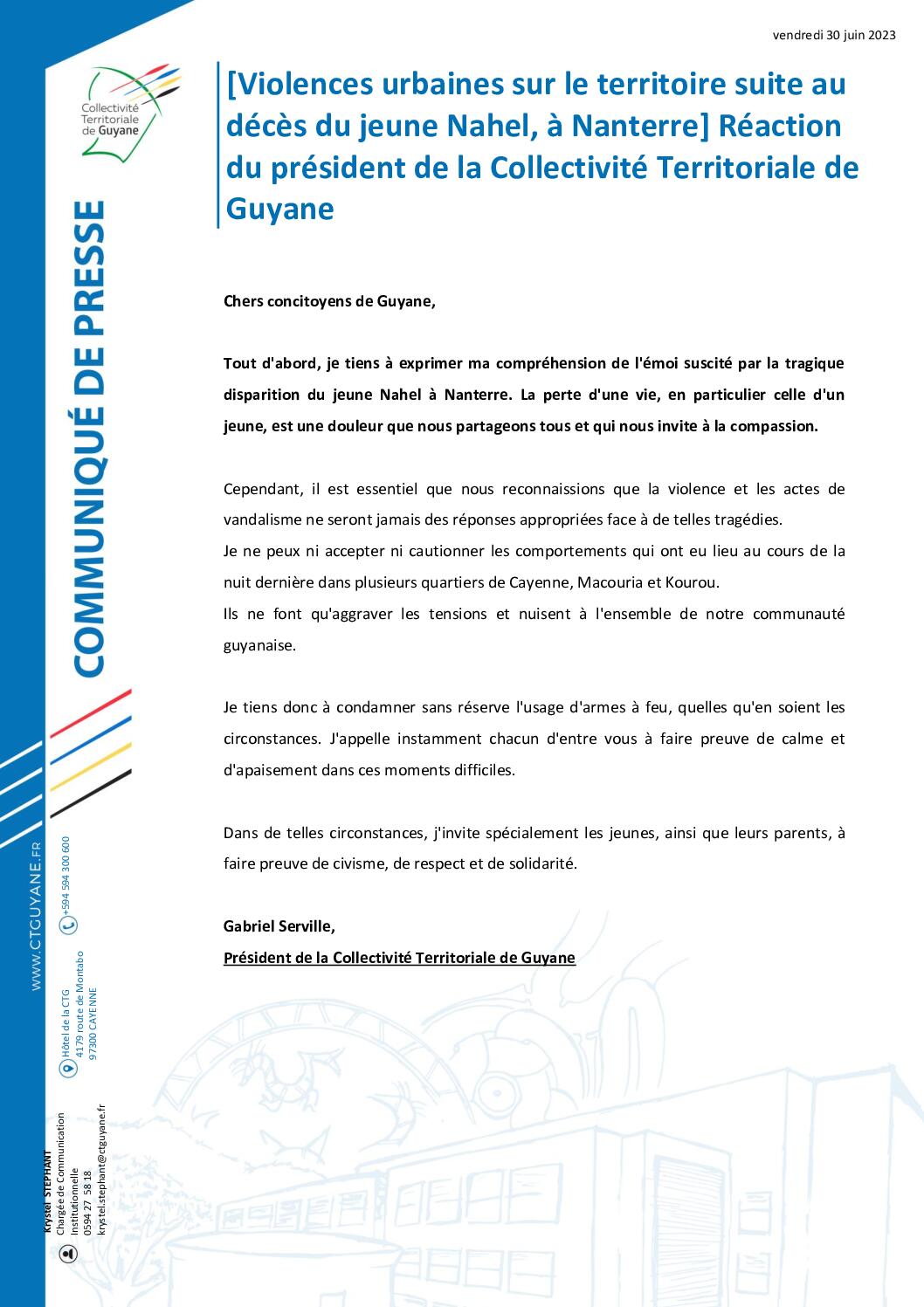 [COMMUNIQUÉ] Violences urbaines sur le territoire suite au décès du jeune Nahel, à Nanterre – Réaction du président de la Collectivité Territoriale de Guyane
