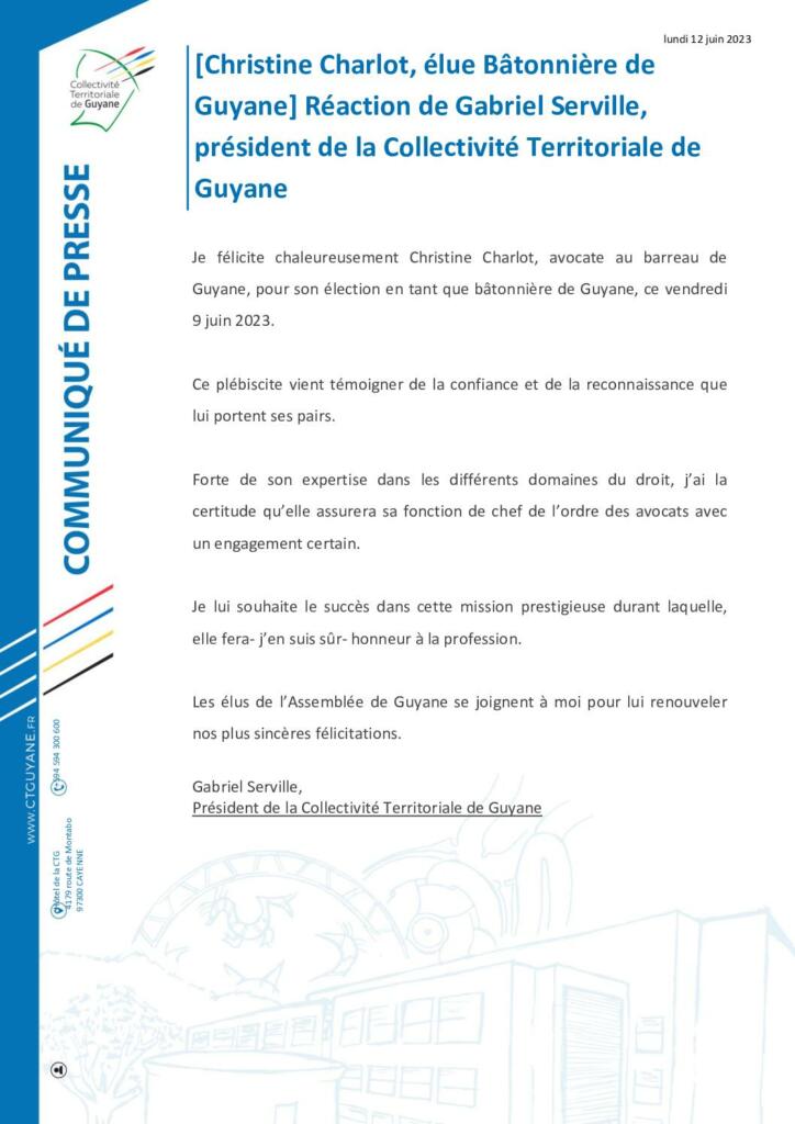 [COMMUNIQUÉ]Christine Charlot, élue Bâtonnière de Guyane : réaction de Gabriel Serville, président de la Collectivité Territoriale de Guyane