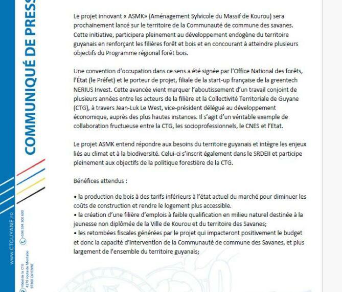Une convention d’occupation dans ce sens a été signée par l’Office National des forêts, l’État (le Préfet) et le porteur de projet, filiale de la start-up française de la greentech NERIUS Invest. Cette avancée vient marquer l’aboutissement d’un travail conjoint de plusieurs années entre les acteurs de la filière et la Collectivité Territoriale de Guyane (CTG), à travers Jean-Luk Le West, vice-président délégué au développement économique, auprès des plus hautes instances. Il s’agit d’un véritable exemple de collaboration fructueuse entre la CTG, les socioprofessionnels, le CNES et l’Etat.