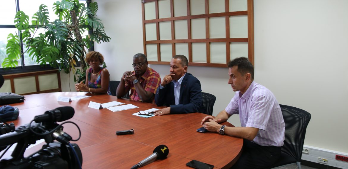 Suite à la réunion de travail en Préfecture lundi, une conférence de presse était donnée mardi 12 septembre 2017, en présence du Président Rodolphe ALEXANDRE, du 4ème Vice-Président délégué aux sports et au cadre de vie, Jean-Claude LABRADOR, du Directeur Général des Services de la CTG, Hervé TONNAIRE et de la Directrice Générale Adjointe Valérie CASTOR, pour faire le point sur les conditions d’accès aux équipements sportifs de la CTG dans le contexte national de la suppression progressive des emplois aidés et sur les avancées concernant ce sujet.
