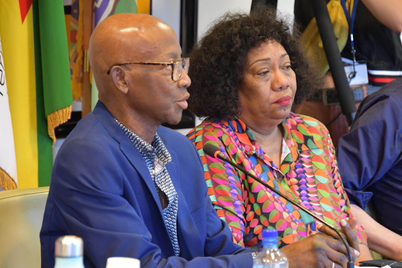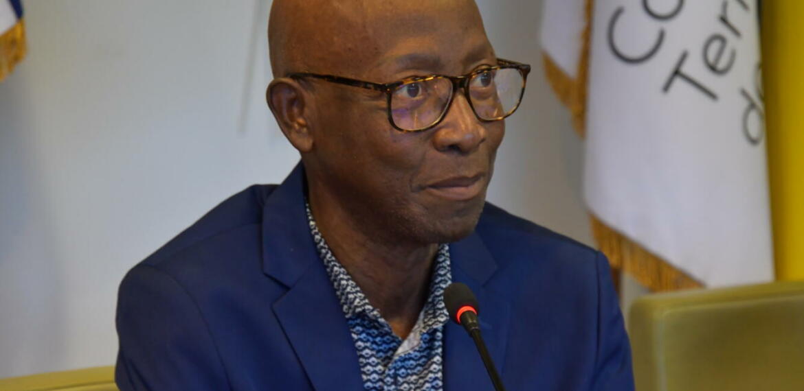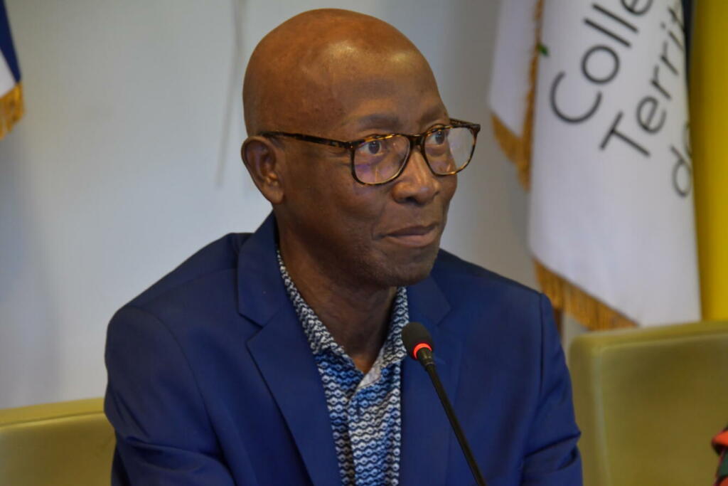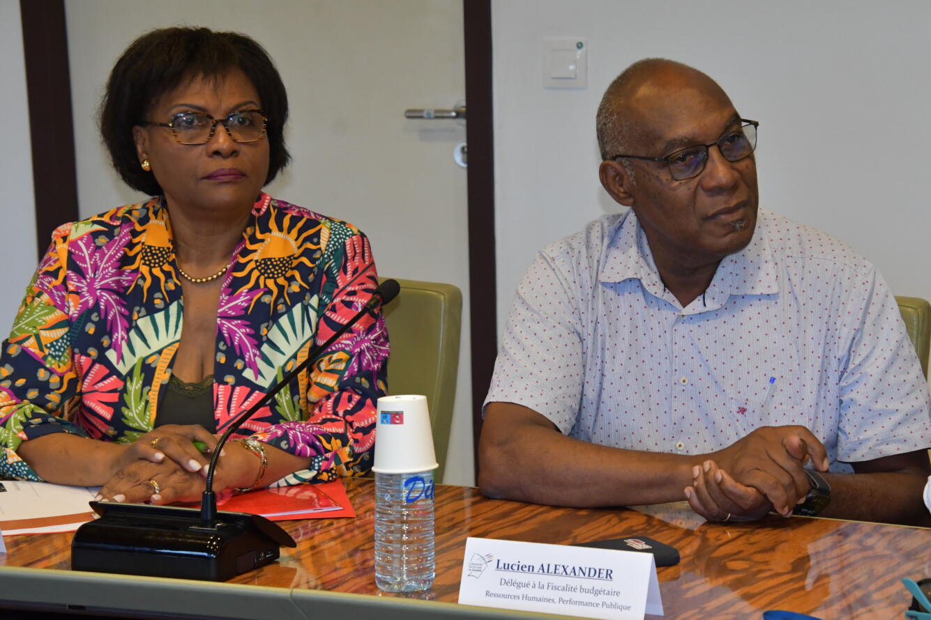 Gabriel Serville a tenu cette conférence de presse aux côtés des élus territoriaux : Annie Robinson Chocho, déléguée à l’éducation et aux constructions scolaires ; Chester Léonce, délégué à l’aménagement du territoire, au désenclavement et aux transports ; et Lucien Alexander, délégué à la fiscalité et à la performance budgétaire.