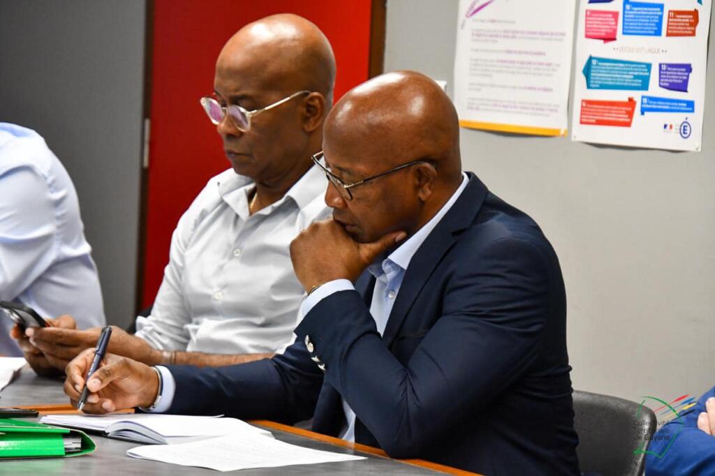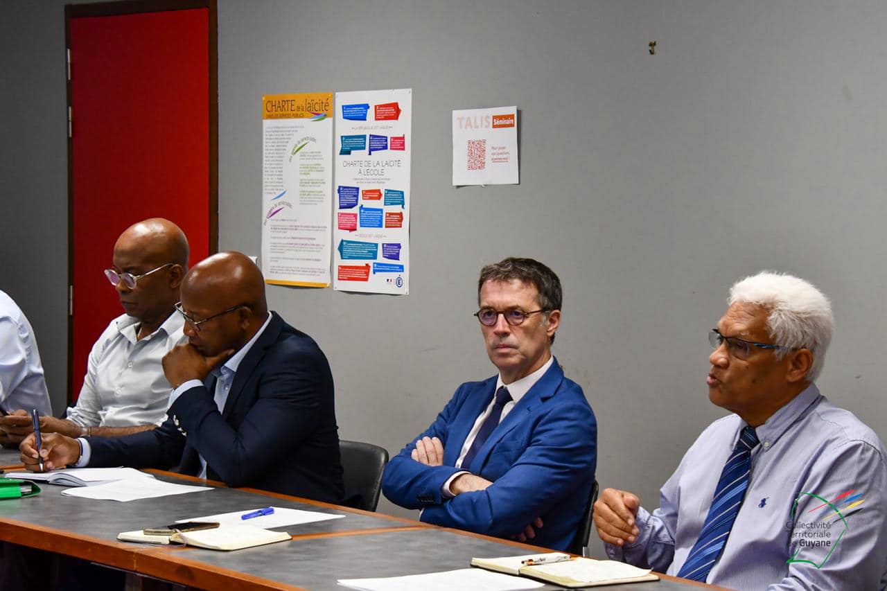 Gabriel Serville, président de la CTG, Philippe Dubecco, recteur de la région Guyane, Patrick Lecante, maire de la commune de Montsinéry, Claude Lemki, élu à la mairie de Macouria, Serge Smock, président de la CACL, des représentants des enseignants, se réunissaient ce lundi 5 février 2024, afin d’échanger sur l’avancée des travaux du collège de Montsinéry.