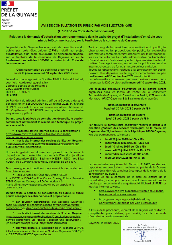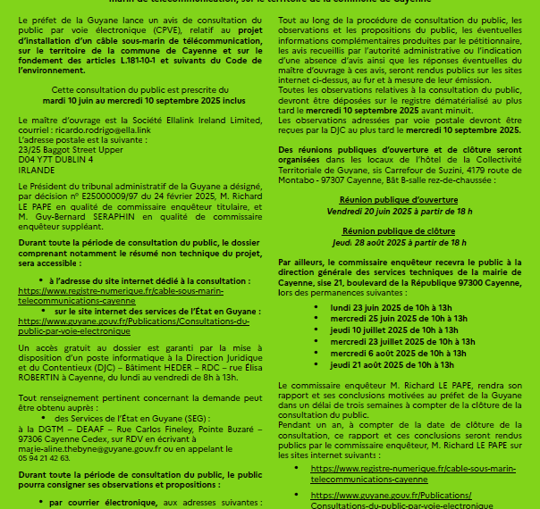 Consultation du public par voie électronique relative à la demande d’autorisation environnementale du projet d’installation d’un câble sous-marin de télécommunication dit « Luma@link », sur la commune de Cayenne Cette consultation du public est prescrite du mardi 10 juin au mercredi 10 septembre 2025 inclus.