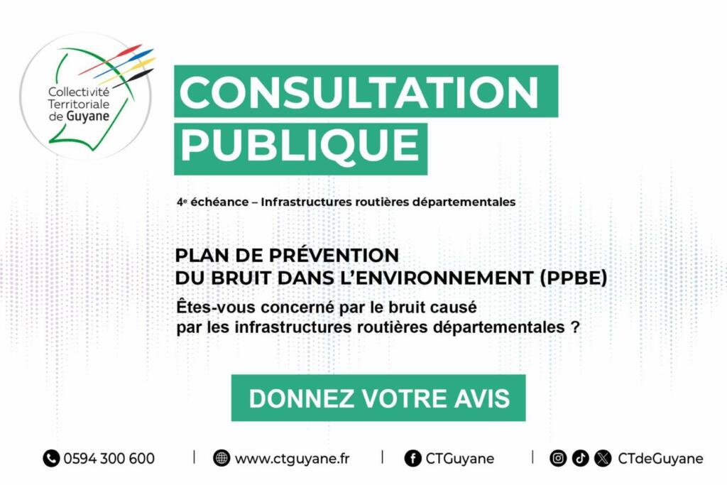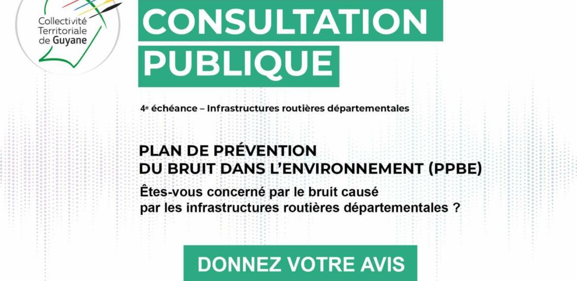 La Collectivité Territoriale de Guyane informe le public de l’ouverture de la consultation publique relative au projet de Plan de Prévention du Bruit dans l’Environnement (PPBE) – 4ᵉ échéance, concernant les infrastructures routières relevant de sa compétence.