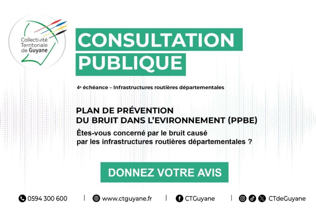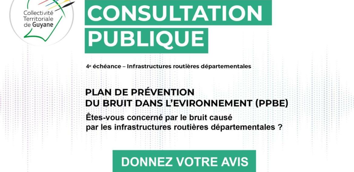 La Collectivité Territoriale de Guyane informe le public de l’ouverture de la consultation publique relative au projet de Plan de Prévention du Bruit dans l’Environnement (PPBE) – 4ᵉ échéance, concernant les infrastructures routières relevant de sa compétence.