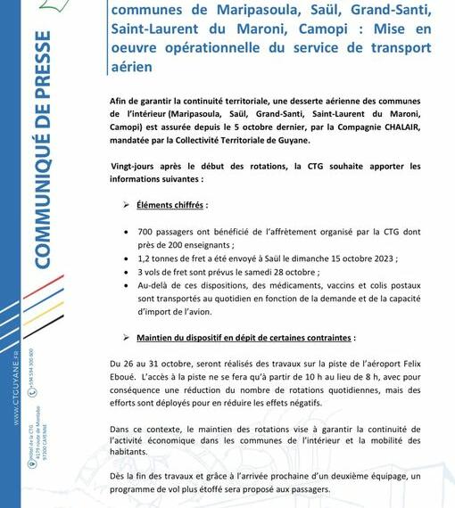 Afin de garantir la continuité territoriale, une desserte aérienne des communes de l’intérieur (Maripasoula, Saül, Grand-Santi, Saint-Laurent du Maroni, Camopi) est assurée depuis le 5 octobre dernier, par la Compagnie CHALAIR, mandatée par la Collectivité Territoriale de Guyane.