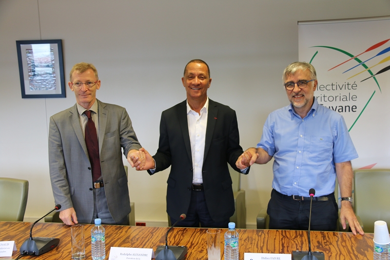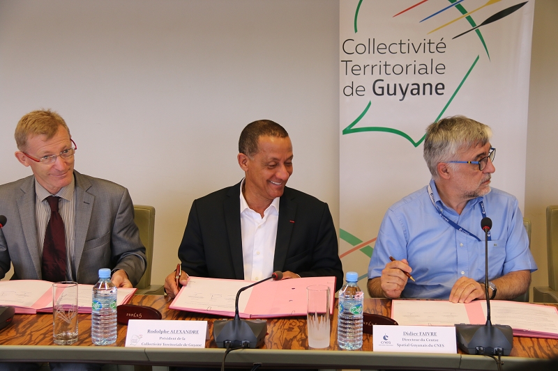 Ce Mardi 20 décembre, le Président de la Collectivité Territoriale de Guyane, Rodolphe Alexandre, a signé avec le Directeur du Centre Spatial Guyanais du Centre National d’Etudes Spatiales (CNES), Didier Faivre et le Secrétaire Général adjoint aux Affaires Régionales, Yves-Marie Renaud, un avenant à la convention tripartite qui liait déjà le CNES, l’Etat et l’ex-Région Guyane puis la CTG depuis 2014. Celui-ci engage l’agence française de l’espace à une contribution financière en faveur du développement de la Guyane à hauteur 1 million 390 mille euros qui viennent s’ajouter aux 26 382 433 millions d’euros déjà engagés pour la période 2014-2020, soit un total de 27 772 433 millions d’ euros au service du développement économique et social du territoire.