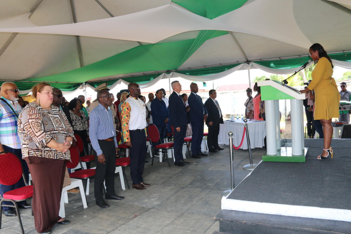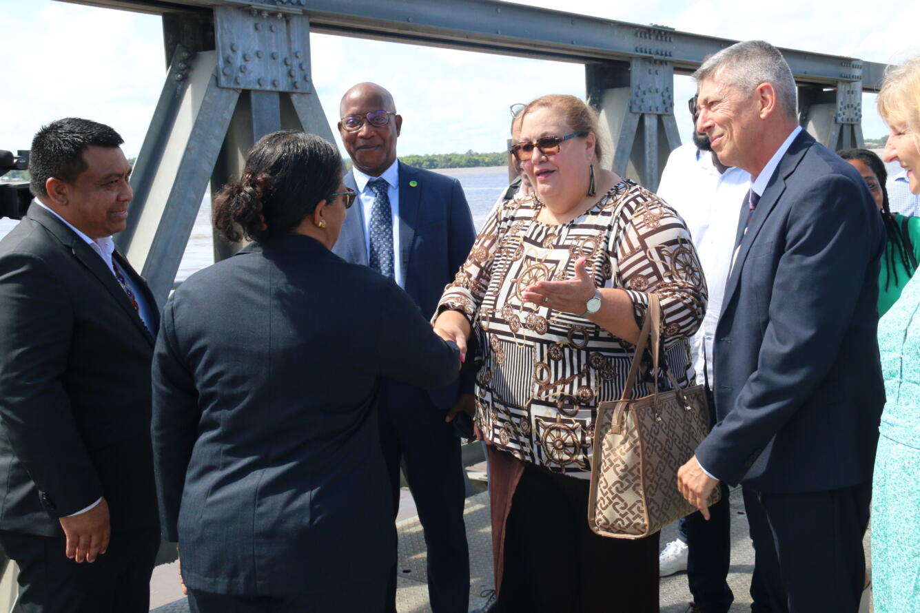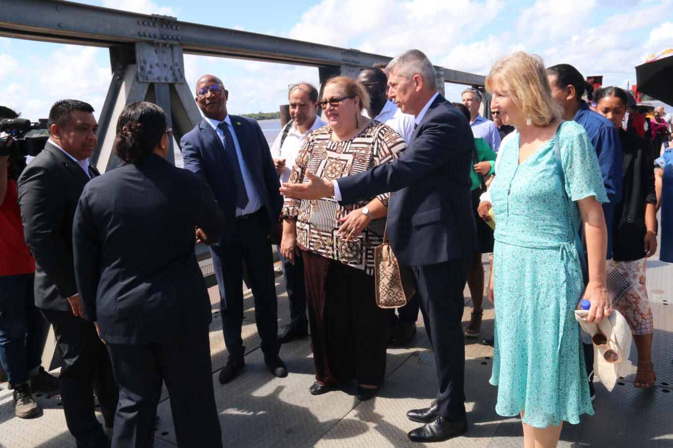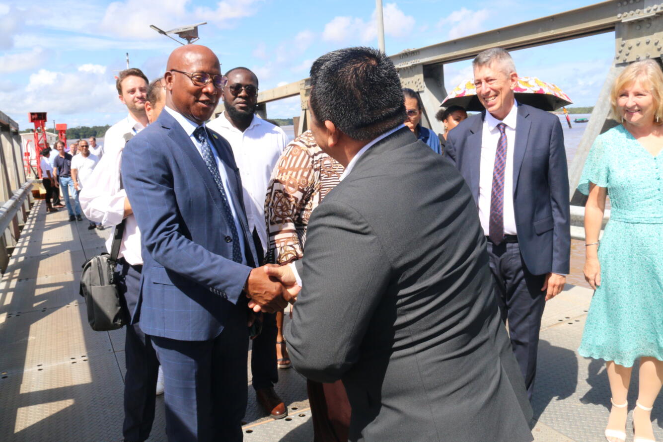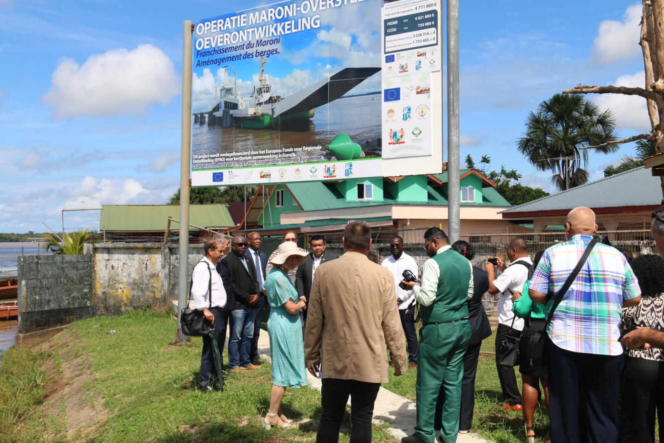Sur place, la délégation guyanaise a été accueillie par Albert Jubithana, ministre des Transports, des Communications, Elizabeth Bradley, chargée du développement international et de la coopération au sein du Ministère des affaires, et du Tourisme de la République du Suriname, Nicolas de Lacoste, Ambassadeur de France au Suriname et au Guyana et Andreas Talea directeur du port de Paramaribo (Havenbeheer). Ensemble, ils ont procédé au dévoilement du panneau de présentation de l’opération avant de donner la parole aux officiels en présence notamment du commissaire du district de Marowijne et de nombreux invités.