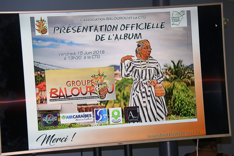 La Présidente et Fondatrice du groupe folklorique Balourou, Cornelia Birba a présenté le 18 juin dernier, son premier opus intitulé « Groupe Balourou » avec l’un des titres phares « Cono rivé » en présence du Président de la Collectivité Territoriale de Guyane (CTG), Rodolphe Alexandre, du Vice-Président, Claude Plenet et de nombreux invités aux rythmes des danses et chants traditionnels guyanais.