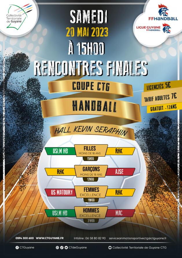 Le Samedi 20 mai 2023 se tiendra la finale de la Coupe CTG de handball, organisée par la Collectivité Territoriale de Guyane, en partenariat avec la ligue de Handball de Guyane et la Fédération française de Handball.